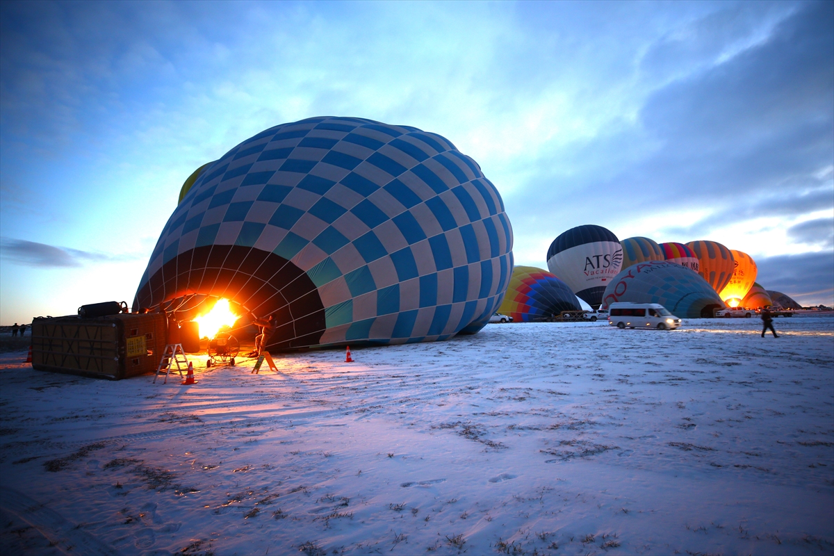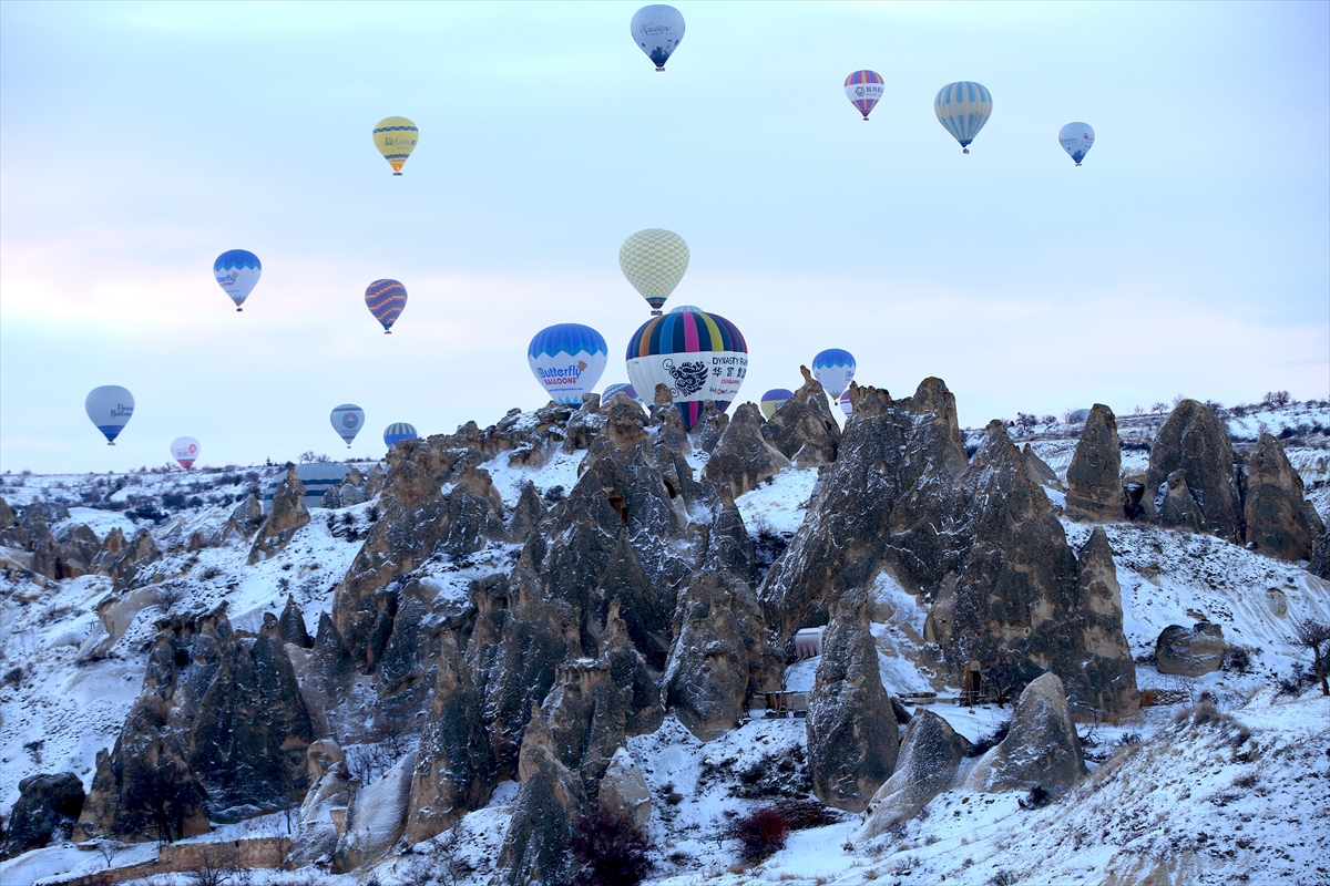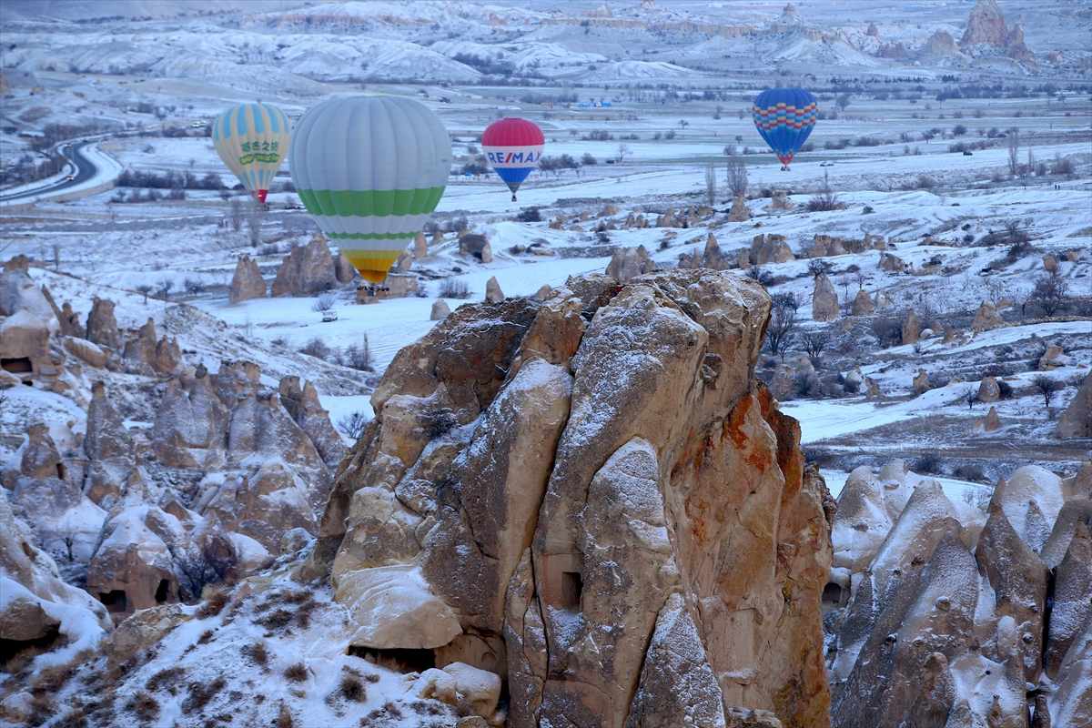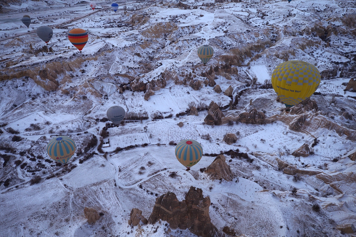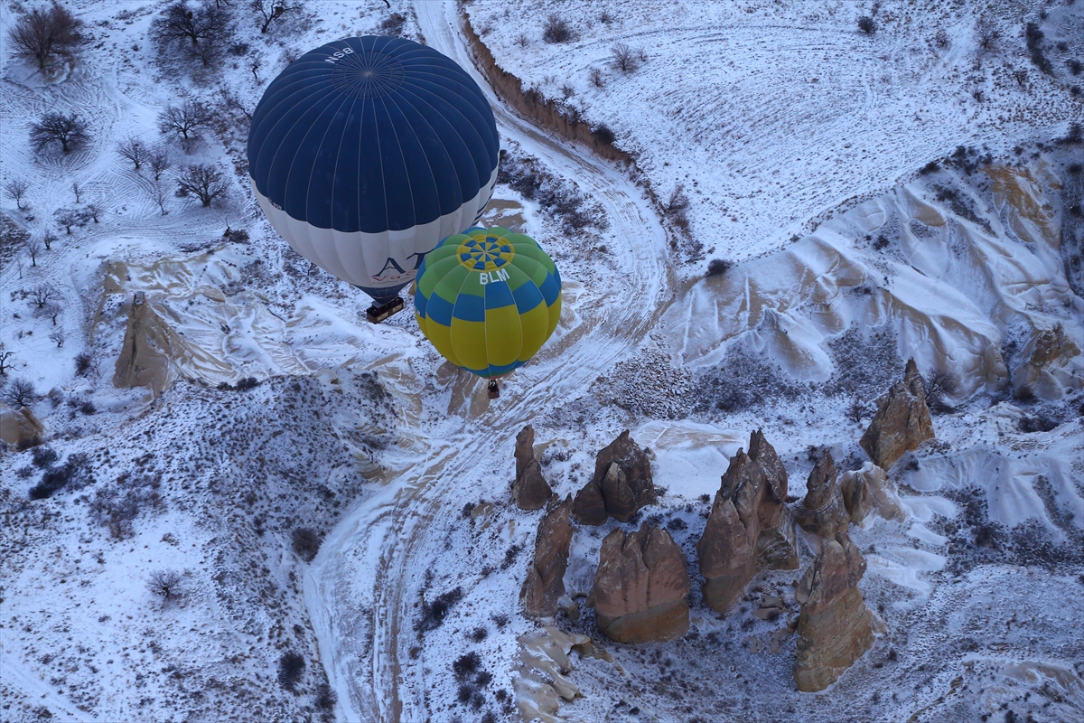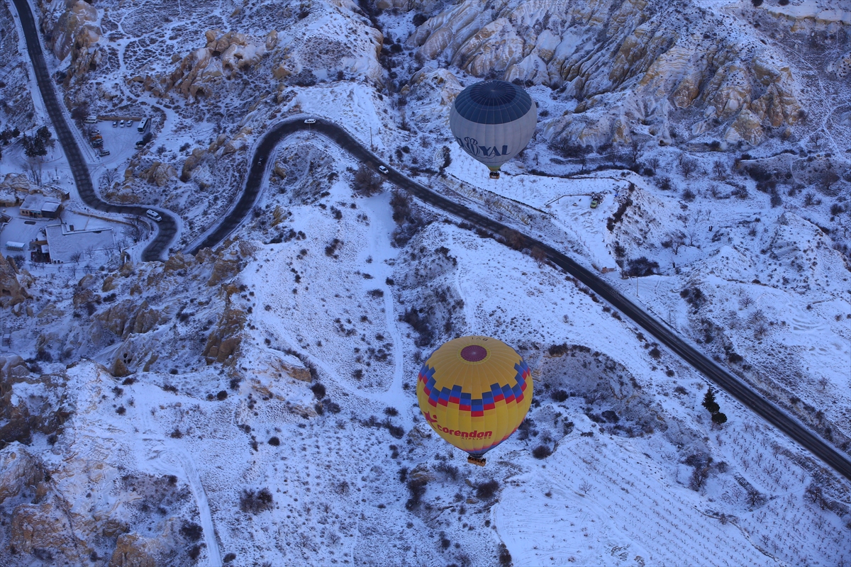 NEVŞEHİR (AA) - BEHÇET ALKAN - Kış tatilini Kapadokya'da geçiren yerli ve yabancı turistler, bölgenin karla kaplı manzarasını, sıcak hava balon turuna katılarak gökyüzünden izliyor.