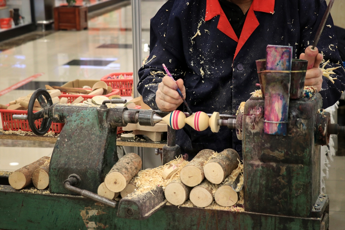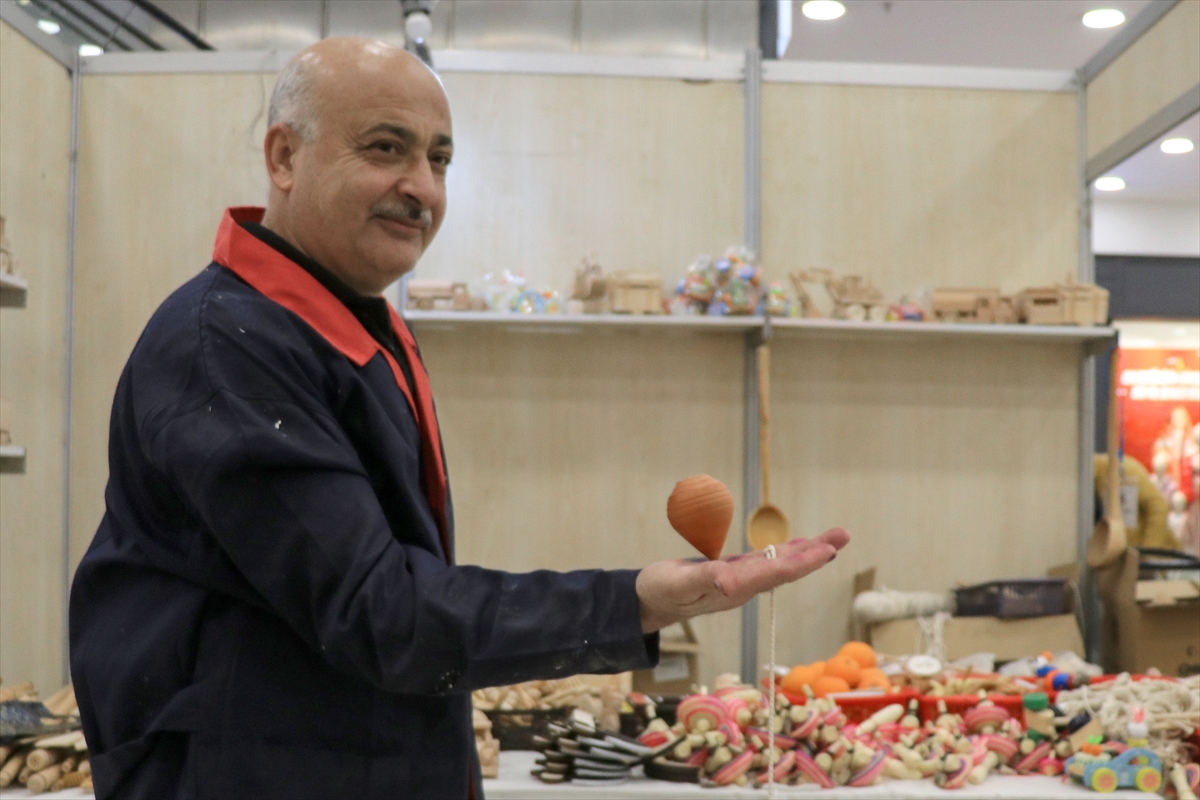 Ekrem usta, oyuncağı unutturmamak için Türkiye genelinde geleneksel el sanatlarının sergilendiği etkinliklere katılarak torna tezgahında topaç yapıyor.