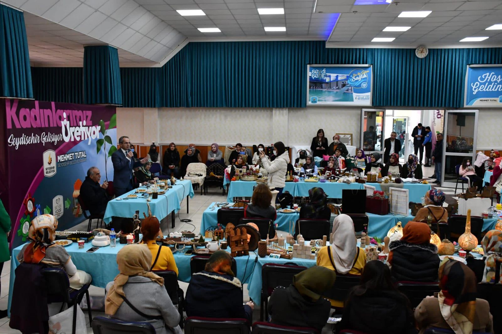 Belediye Düğün Salonu'nda hediyelik eşyalardan, süs eşyalarına, meyve ve sebze kurularından yöresel ürünlerin turşularına, reçellerine ve konservelerine kadar üretilen birçok ürünün sergilendiği stantlar büyük ilgi gördü.