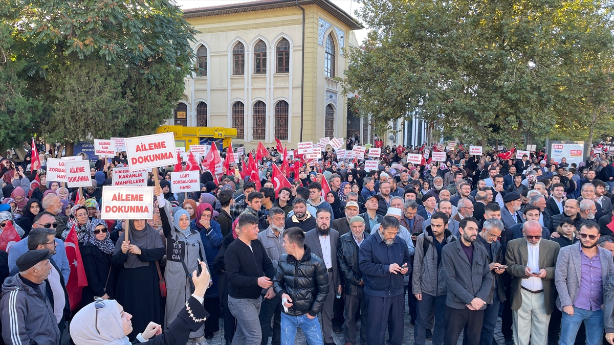 Kılıçarslan Meydanı'nda toplanan ve "Aileme Dokunma", "LGBT Zorbalığına Hayır", "Gökkuşağımı Kirletme", "Ailemiz Son Sığınağımız", "Küreselci Dayatmaya Hayır", "Fıtratımız Kimliğimizdir" dövizleri taşıyan kalabalık, Alaaddin Bulvarı'ndan Kayalıpark'a yürüdü.