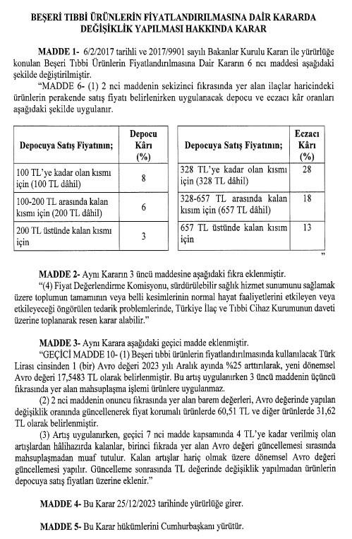 Resmi Gazete'de yayımlanan kararla ilaç fiyatlamasında kullanılan euro kuru güncellendi. Daha önce 14 lira olan güncel euro değeri, kararla birlikte 17,54 liraya yükseltildi. Yüzde 25'lik artış oranı 25 Aralık'tan itibaren geçerli olacak.