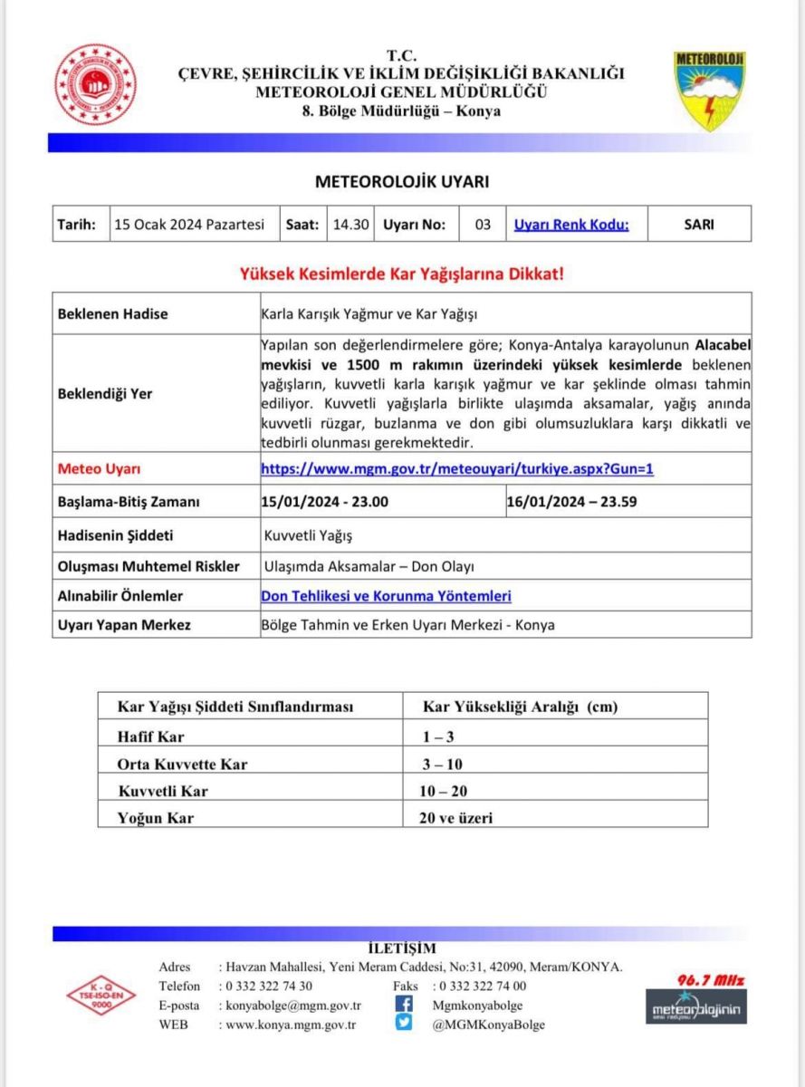 Meteoroloji 8.Bölge Müdürlüğü'nden Konya-Antalya karayolu Alacabel mevkiisine ve 1500 m rakımın üzerindeki yüksek kesimlere sarı kodlu uyarı geldi.