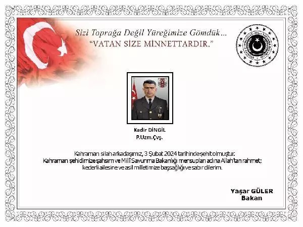 Bakanlıktan yapılan açıklamada, "Irak kuzeyi harekat bölgesinde 3 Şubat 2024 tarihinde bölücü terör örgütü mensupları tarafından yapılan taciz atışı sonucu kahraman silah arkadaşımız Piyade Uzman Çavuş Kadir Dingil şehit olmuş, iki kahraman silah arkadaşımız yaralanmıştır. Yaralılarımız derhal hastaneye sevk edilerek tedavilerine başlanmıştır. Bizleri derin bir acı ve üzüntüye boğan bu olayda hayatını kaybeden aziz şehidimize Allah'tan rahmet, kederli ailesine, Türk Silahlı Kuvvetleri ile asil milletimize başsağlığı ve sabır, yaralılarımıza da acil şifalar dileriz" denildi.