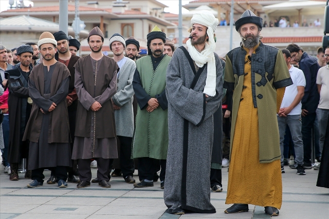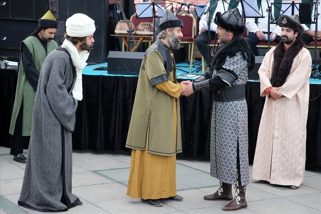 Konya Büyükşehir Belediyesince Mevlana Meydanı'nda düzenlenen "Teşrif-i Mevlana" etkinlikleri kapsamında, Mevlana ve ailesinin Konya'ya gelişi temsili olarak canlandırıldı.
