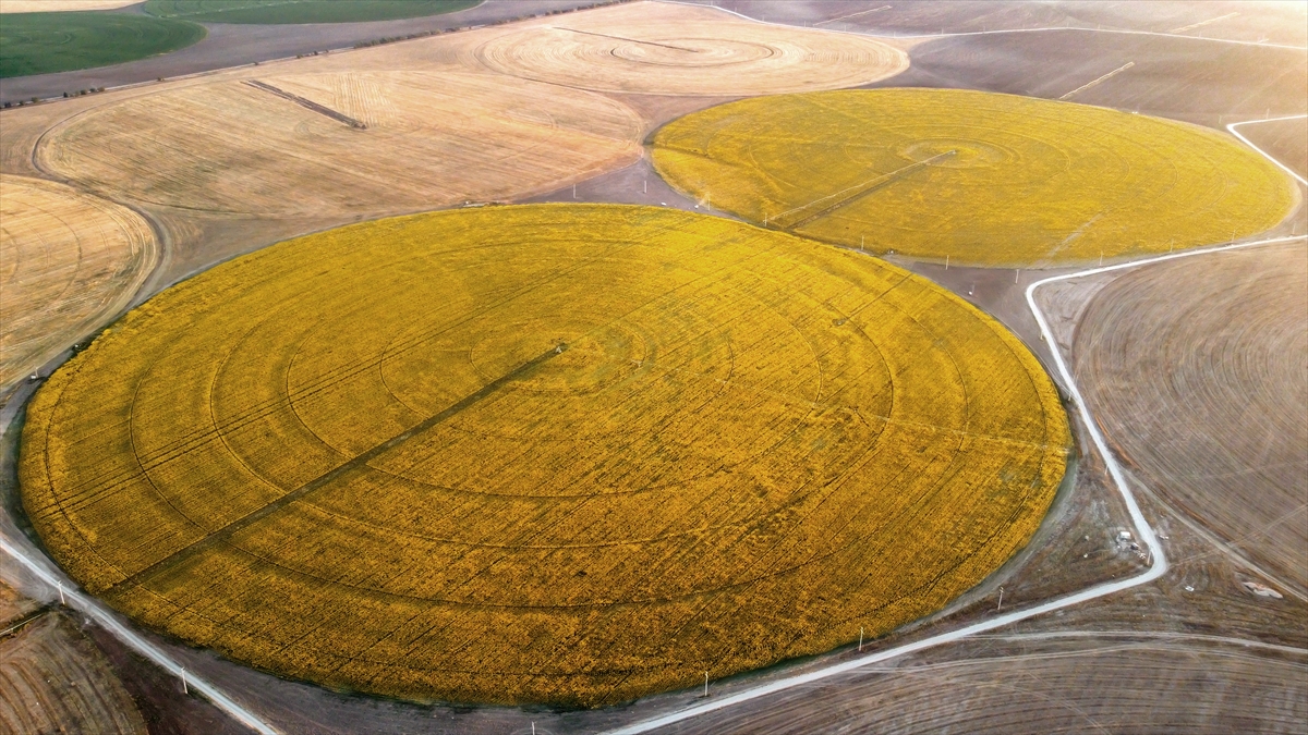 Tarlanın merkezini esas alan, yarı çap uzunluğundaki hareketli robotik sulama sistemine göre ekimin yapıldığı 6 dairesel tarlada açan ayçiçekleri, güzel görüntü oluşturuyor.