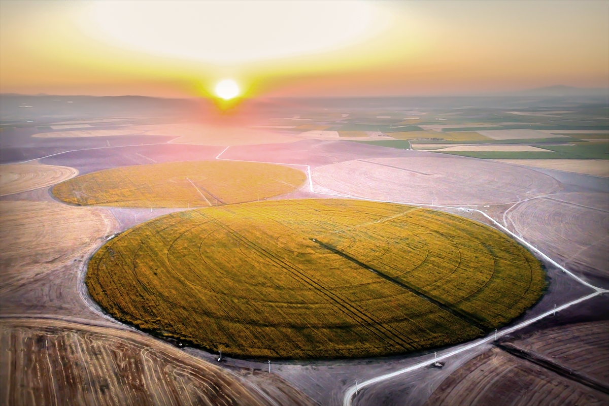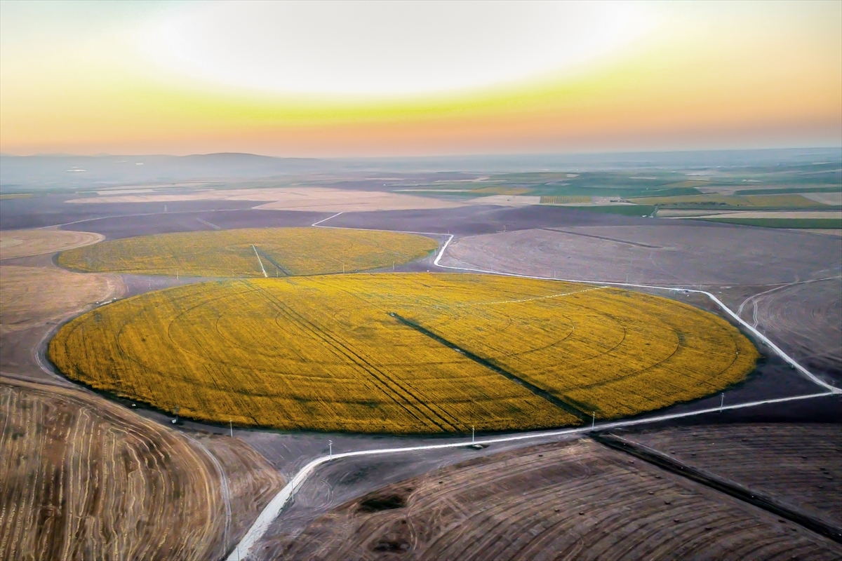 Tarım ve Orman Bakanlığına bağlı Tarım İşletmeleri Genel Müdürlüğü (TİGEM) Altınova Tarım İşletmesinde her biri 365 dekarlık 78 dairesel tarla, üzerinde ekili ürünlerle sarıya büründü.