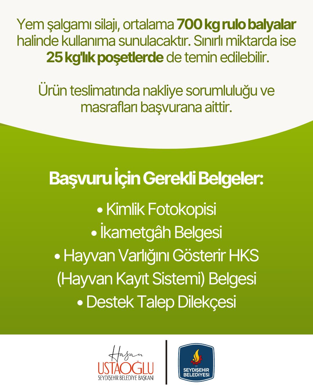 Başkan Ustaoğlu, “kırsal kalkınmayı destekleme ve yerli üreticilerin yanında olma hedefiyle Yem Şalgamı (Lenox) Silajı Desteği başvurularımız başladı. İlçemizde hayvancılıkla uğraşan çiftçilere yönelik sağlanacak bu destekle kaliteli kaba yem ihtiyacının büyük bölümü karşılanmış olacak. Belediye ve kooperatif iş birliğiyle üretilen silajlar için başvurular, Belediyemize şahsen yapılacak.