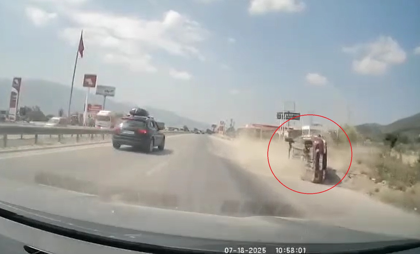 Kaza, saat 11.00 sıralarına Orhangazi- Gemlik yolu Çeltikçi Kavşağı yakınlarında meydana geldi. Gemlik yönüne giden otomobilin sürücüsü, sağ tarafından süratle geçen hafif ticari araç nedeniyle sola doğru ani manevra yapınca direksiyon kontrolünü yitirdi. Savrulan otomobil yol kenarına devrilirken, sürücü hafif belirtildi. O anlar bir başka otomobilin araç kamerasına yansıdı. (DHA)