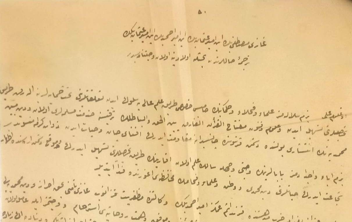 “Gazi Mustafa Bey İbni Emir Osman Bey İbni Emir Ahmet Bey İbni Emir Osman Bey’in Tercümei Hallerinden Bahisle Evladına Olan Vasiyetnamesidir:Oğlum Ali bizim sülalemiz ulema ve fuhela? ve hukemanın hamisi hususi tariki ilmi aliye sülukeden taallukatlarını tahtı himayelerine alarak tariki tahsillerini teshil eden ve ulum ve fünunmiftahülkur’anülfarukbeynel hak vel batılın terakkisine hizmeti Müslimeleri olan ve dini mübiniMuhammediye’nin intişarı yolunda düşman karşısında cansiperane mukavemet ederek efnayı can ve hayat eden zevatı kirama mensuptur. Bizim abad ve ecdadımız babalarınınvasiyyeti veçhile saliki ilim olan ve egaribinin tariki tahsillerini teshil ederek ve mevkii düşman arasında izharı şecaat ederek hayatlarını dini Muhammedi ve vatan ve ulema ve fuhanın muhafazası uğrunda feda ettiler.