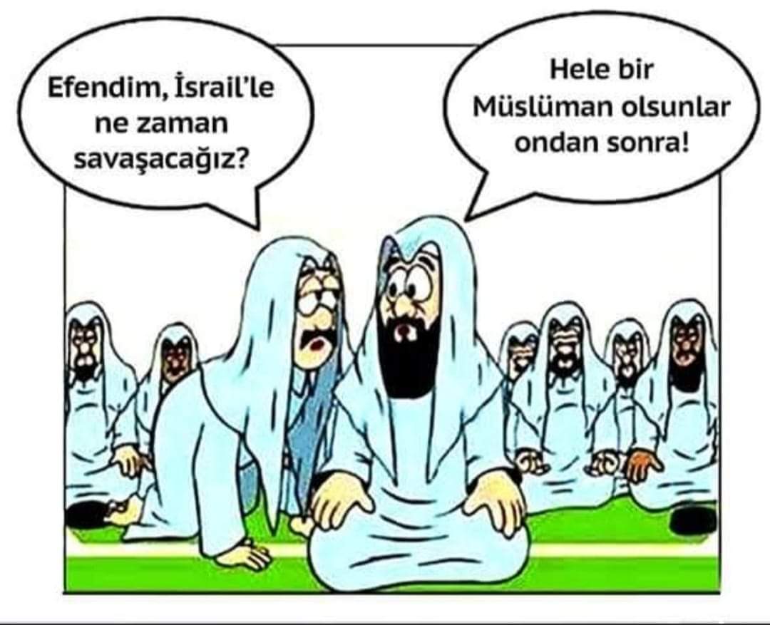 . Karikatürde otoriteye, krala her neyse ney sorulan İsrail ilesavaşmayacak mıyız sorusuna otoritenin vermiş olduğu efsane cevaptan ibarettir. Ne diyor otorite hele bir Müslüman olsunlar da sonra, nasıl bir zeka ürünü bu çizeni takdir ederken masajı da görmek lazım.