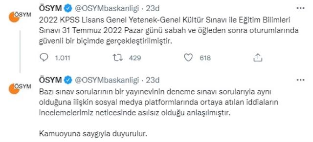 Tepkiler sonrası ÖSYM'nin resmi Twitter hesabından bir açıklama yapıldı. Açıklamada, "2022 KPSS Lisans Genel Yetenek-Genel Kültür Sınavı ile Eğitim Bilimleri Sınavı 31 Temmuz 2022 Pazar günü sabah ve öğleden sonra oturumlarında güvenli bir biçimde gerçekleştirilmiştir. Bazı sınav sorularının bir yayınevinin deneme sınavı sorularıyla aynı olduğuna ilişkin sosyal medya platformlarında ortaya atılan iddiaların incelemelerimiz neticesinde asılsız olduğu anlaşılmıştır. Kamuoyuna saygıyla duyurulur." ifadeleri yer aldı.