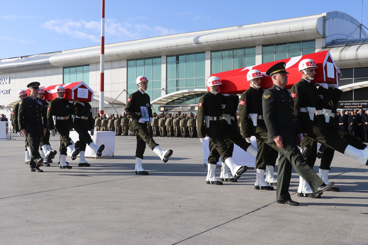 Şehit Sözleşmeli Ulaştırma Er Ali Arslan ile İstihkam Uzman Çavuş Muammer Ay'ın Türk bayrağına sarılı naaşları, Ağrı Eğitim ve Araştırma Hastanesi morgundan alınarak Ahmedi Hani Havalimanına getirildi.