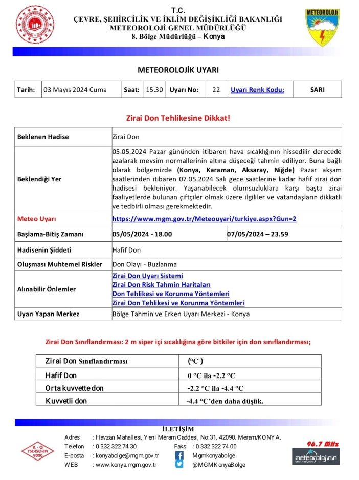 Yapılan açıklamada, “05.05.2024 Pazar gününden itibaren hava sıcaklığının hissedilir derecede azalarak mevsim normallerinin altına düşeceği tahmin ediliyor. Buna bağlı olarak bölgemizde (Konya, Karaman, Aksaray, Niğde) Pazar akşam saatlerinden itibaren 07.05.2024 Salı gece saatlerine kadar hafif zirai don hadisesi bekleniyor. Yaşanabilecek olumsuzluklara karşı başta zirai faaliyetlerde bulunan çiftçiler olmak üzere ilgililer ve vatandaşların dikkatli ve tedbirli olması gerekmektedir." ifadeleri kullanıldı.