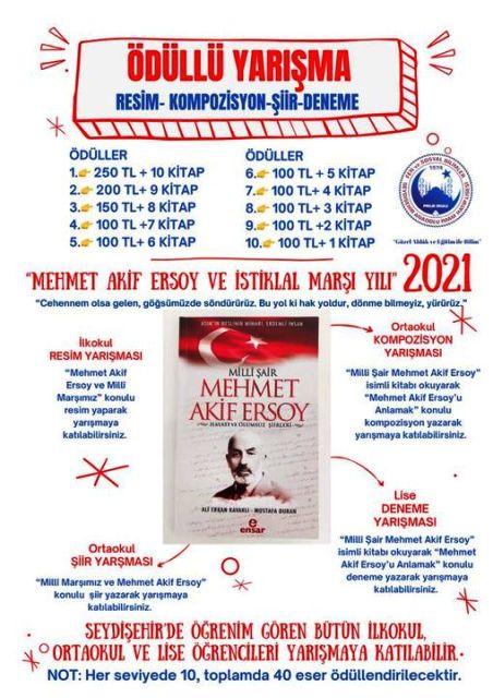 SEYDİŞEHİRDE MEHMET AKİF YILI ANISINA ÖDÜLLÜ YARIŞMA EĞİTİM 27.12.2021 19:01 Seydişehir Anadolu İmam Hatip Lisesinden Ödüllü yarışma Seydişehir’de öğrenim gören bütün öğrenciler yarışmamıza katılabilir Mehmet Akif Ersoy ve İstiklal Marşı Yılı 2021 Resim, Şiir, Kompozisyon, Deneme Yarışması Bu Haberi Paylaşın Facebook Twitter WhatsApp Telegram LinkedIn Pinterest E-posta Kopyala