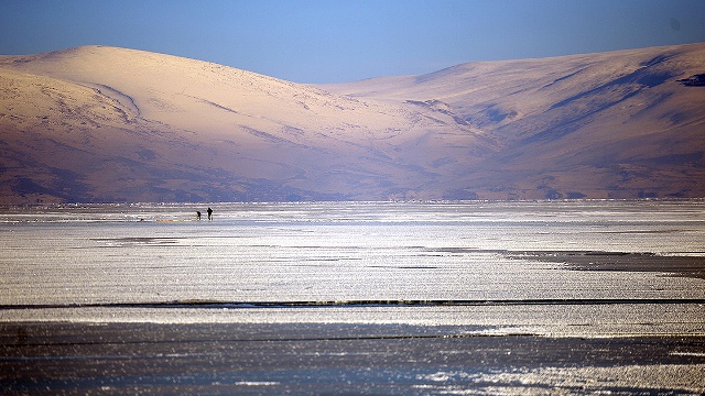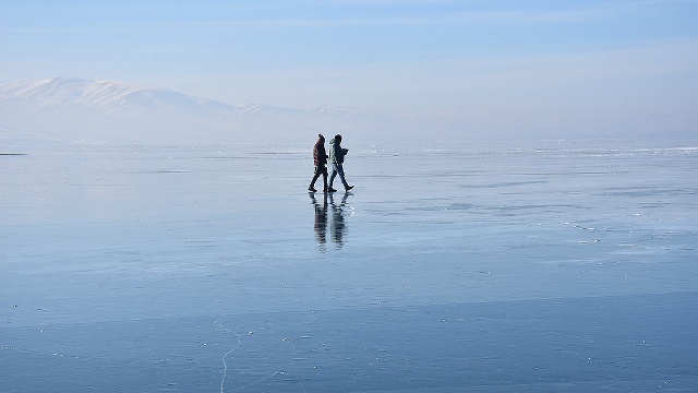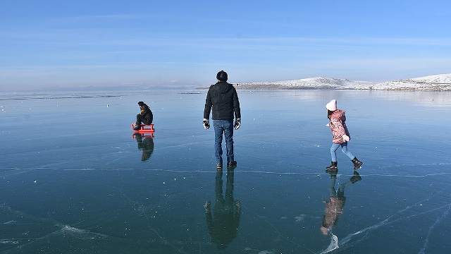 Buz kalınlığının 15 santimetreye ulaşmasıyla Kars ve Ardahan tarafından gölün buzlu yüzeyine çıkan turistler, yürüyüş yaparak keyifli zaman geçirmeye başladı.