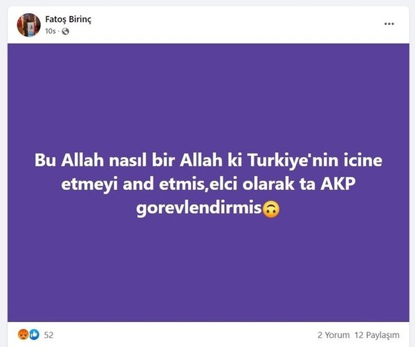 Sosyal medya hesabından yaptığı paylaşımda mukaddes değerlere hakaret eden Birinç yaptığı paylaşımda şu ifadeleri kullanmıştı.