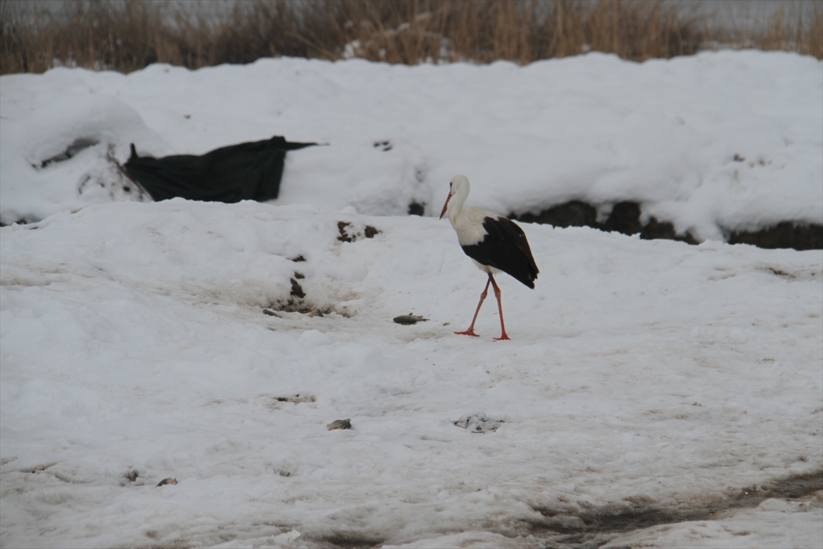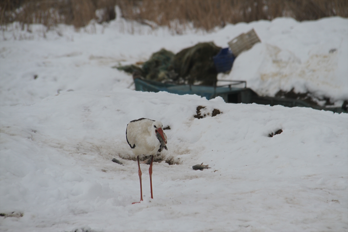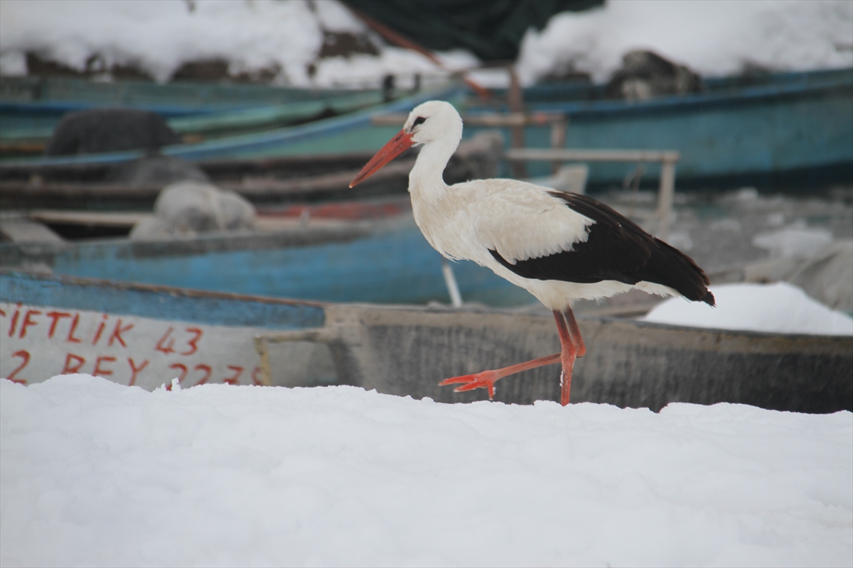 Kıyı kesimleri donan Beyşehir Gölü'nün buz tabakası üzerine de çıkan leylek, bölgede faaliyet gösteren balıkçıların av dönüşü teknesini bekliyor.