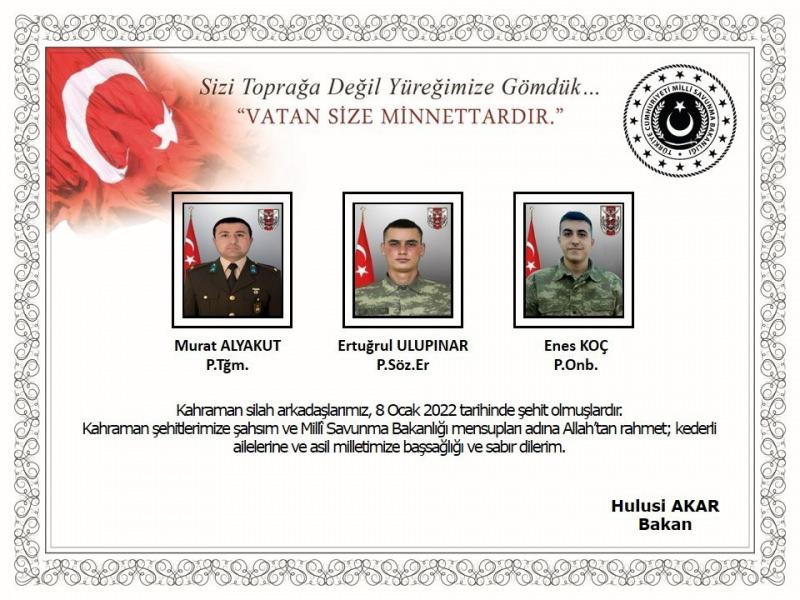 "Akçakale/Şanlıurfa hudut hattında 8 Ocak 2022 tarihinde, teröristlerce döşenen el yapımı patlayıcının patlaması sonucu 3 kahraman silah arkadaşımız Piyade Teğmen Murat Alyakut, Piyade Sözleşmeli Er Ertuğrul Ulupınar ve Piyade Onbaşı Enes Koç şehit olmuştur. Bizleri derin bir acı ve üzüntüye boğan bu olayda hayatını kaybeden aziz şehitlerimize Allah'tan rahmet, kederli ailelerine, Türk Silahlı Kuvvetleri ile asil milletimize başsağlığı ve sabır dileriz." haberi! MSB'den yapılan açıklamada, "Akçakale/Şanlıurfa hudut hattında, 8 Ocak 2022 tarihinde, teröristlerce döşenen El Yapımı Patlayıcının (EYP) patlaması sonucu 3 kahraman silah arkadaşımız, P.Tğm. Murat ALYAKUT, P.Söz. Er Ertuğrul ULUPINAR ve P.Onb. Enes KOÇ şehit olmuştur. Bizleri derin bir acı ve üzüntüye boğan bu olayda hayatını kaybeden aziz şehitlerimize Allah’tan rahmet, kederli ailelerine, Türk Silahlı Kuvvetleri ile asil milletimize başsağlığı ve sabır dileriz." denildi.