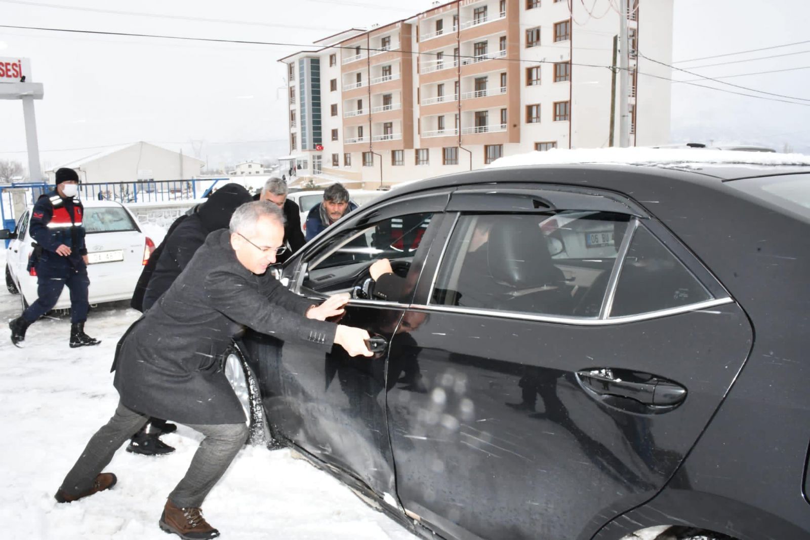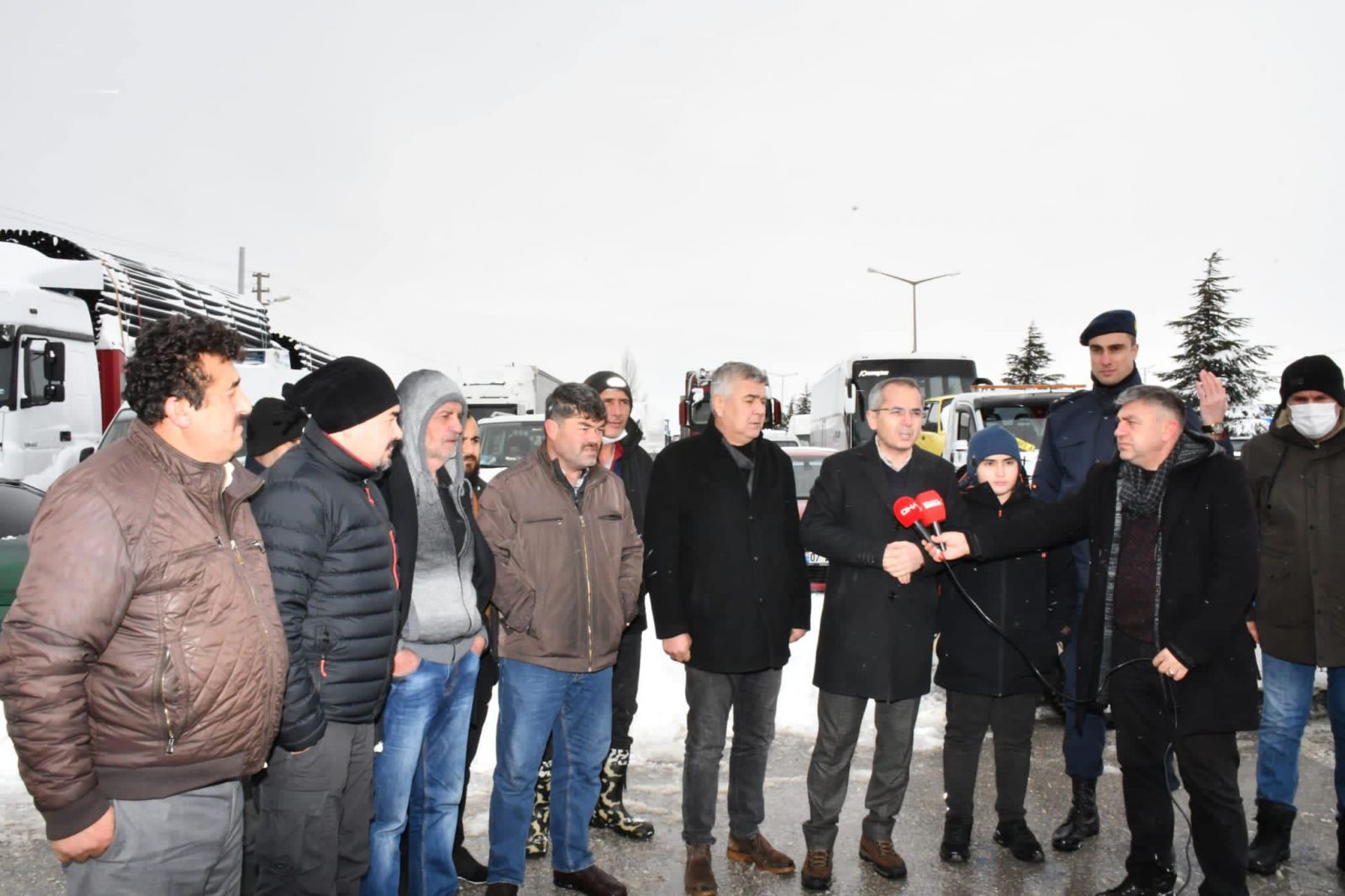Yolda mahsur kalan vatandaşlara geçmiş olsun dileklerini ileten Kaymakam Pişkin, 24 saattir Marangozlar kavşağında bekletilen sürücülere kumanya ikram etti.