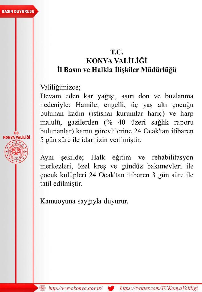 Konya Valiliği şehirde yoğun kar yağışından dolayı bazı kamu görevlilerinin 5 gün idari izinli olduğunu açıkladı. Yapılan duyuruda, “Devam eden kar yağışı, aşırı don ve buzlanma nedeniyle: Hamile, engelli, üç yaş altı çocuğu bulunan kadın ve harp malulü, gazilerden (% 40 üzeri sağlık raporu bulunanlar) kamu görevlilerine 24-28 Ocak tarihleri arasında 5 gün süre ile idari izin verilmiştir. Aynı şekilde; Halk eğitim ve rehabilitasyon merkezleri, özel kreş ve gündüz bakımevleri ile çocuk kulüpleri 24–27 Ocak tarihleri arası 3 gün süre ile tatil edilmiştir. ” Denildi.