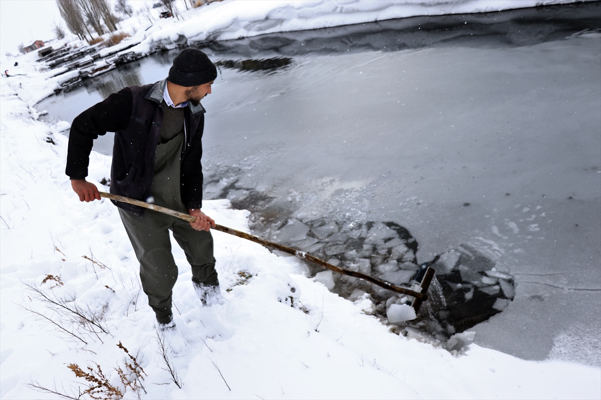 Sürekli buz tutan havuzların yanındaki barakalarda kalan balıkçılar, her gün sopa ve kürekle buz kırma mesaisinin ardından balıkları yemliyor. Aşırı soğuk nedeniyle havuzların dibinde toplanan balıklar, dibe çöken yemlerle besleniyor.