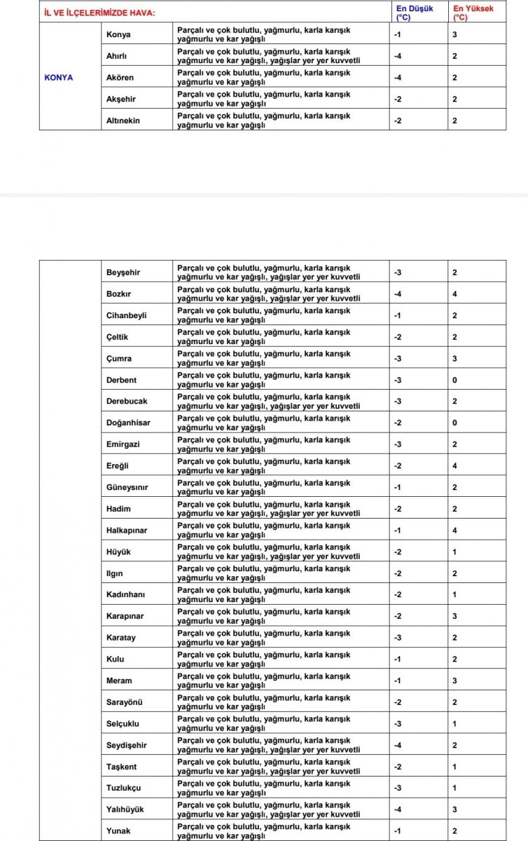 Konya Valiliği’nin Meteoroloji’den gelen tahminleri yayınladığı uyarılar şu şekilde: