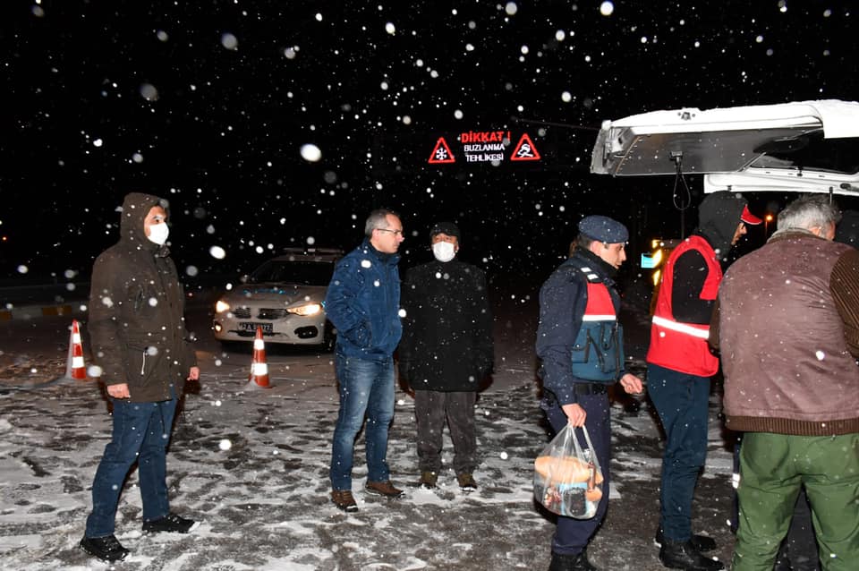 KONYA ( AA ) - Konya'da etkili olan yoğun kar yağışı ve tipi nedeniyle trafiğe kapatılan Seydişehir-Antalya kara yolunda mahsur kalan sürücü ve yolculara kumanya dağıtımı yapıldı.
