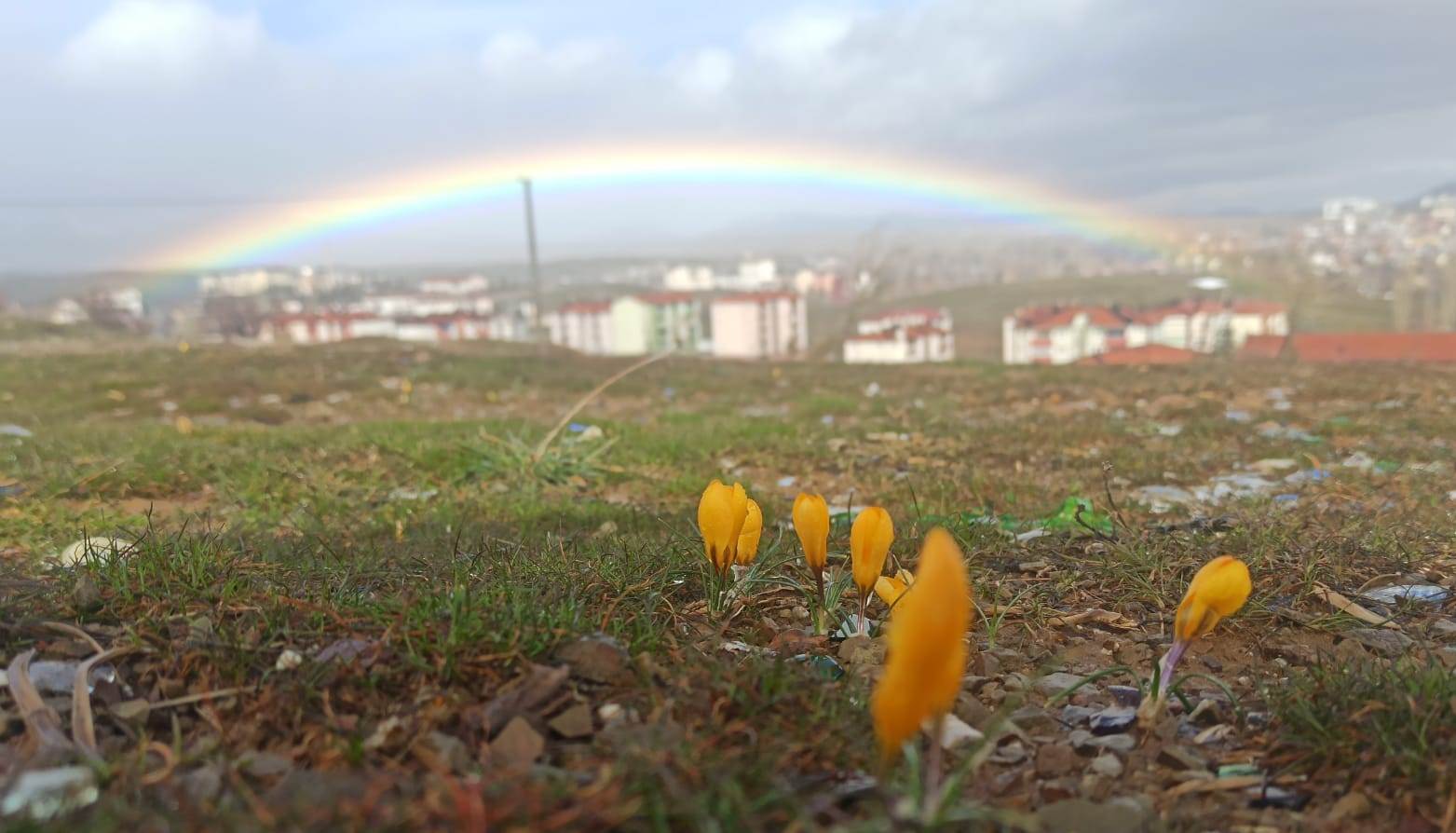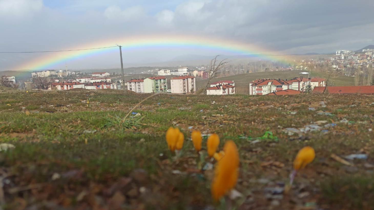 Bu yıl yoğun geçen kışın ardından ilçede cemrelerin düşmesi ile birlikte hava sıcaklığında önemli derecede yükselmeler görülürken ilçede rüzgar ile yağmurda etkili oluyor. Havanın bulutlu ve yağmurlu olmasına rağmen yer yer güneş kendini gösterirken yağmur taneleri ile oluşan gök kuşağı ise görsel bir şölen oluşturuyor