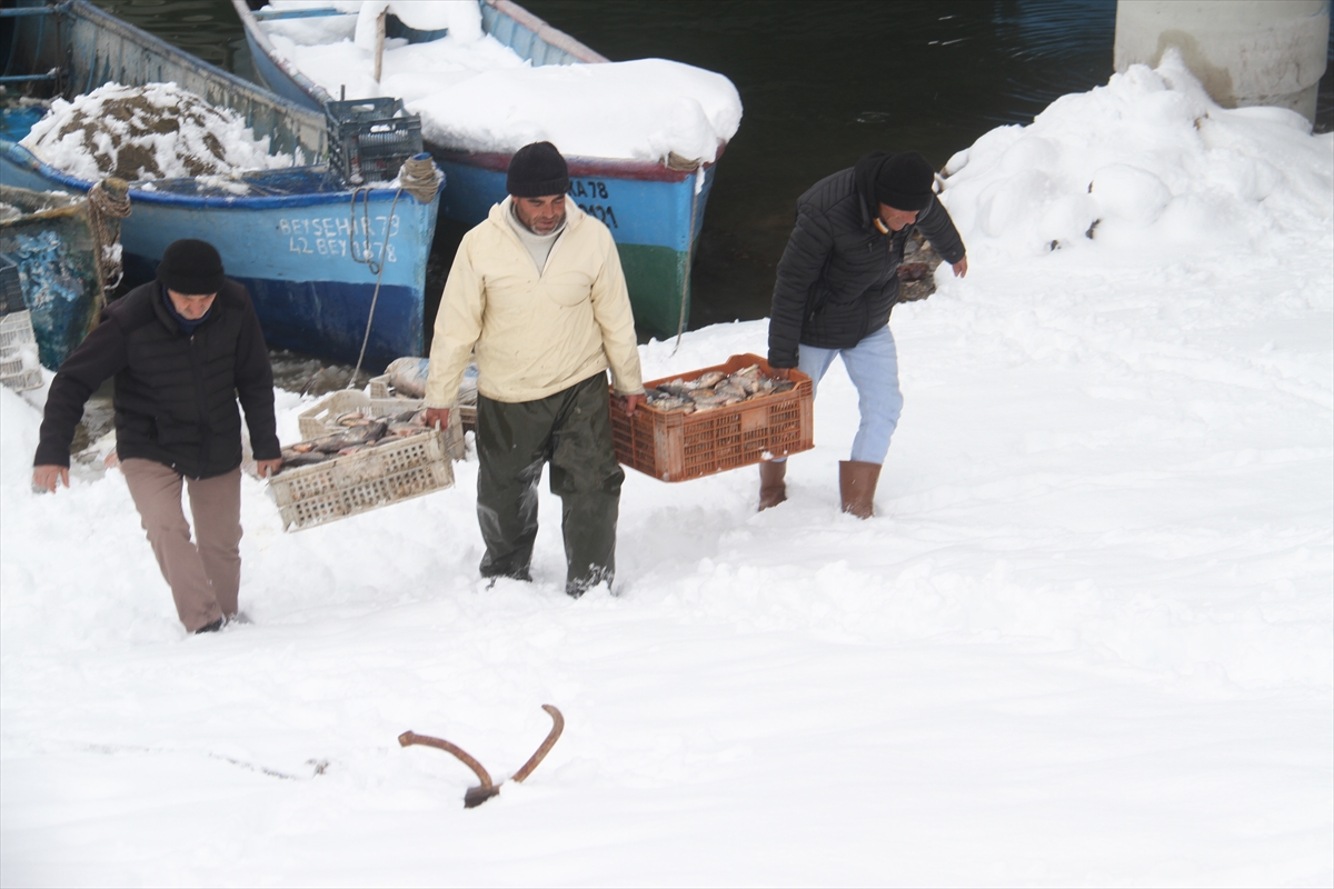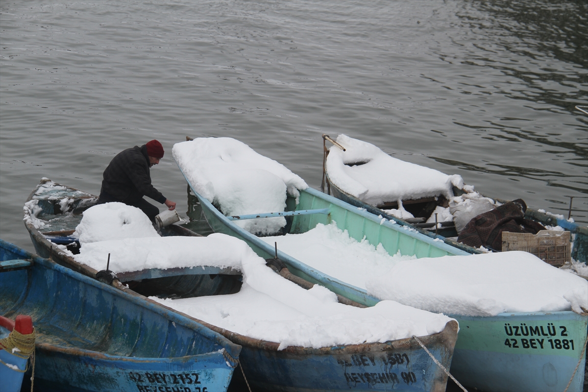 Olumsuz hava şartları, Türkiye'nin en büyük tatlı su gölü olan Beyşehir Gölü'nde balıkçılığı zorlaştırdı. Avlanmaya ara veren balıkçılar limanlara gelerek kar örtüsüyle kaplanan balıkçı teknelerinde temizlik yaptı.