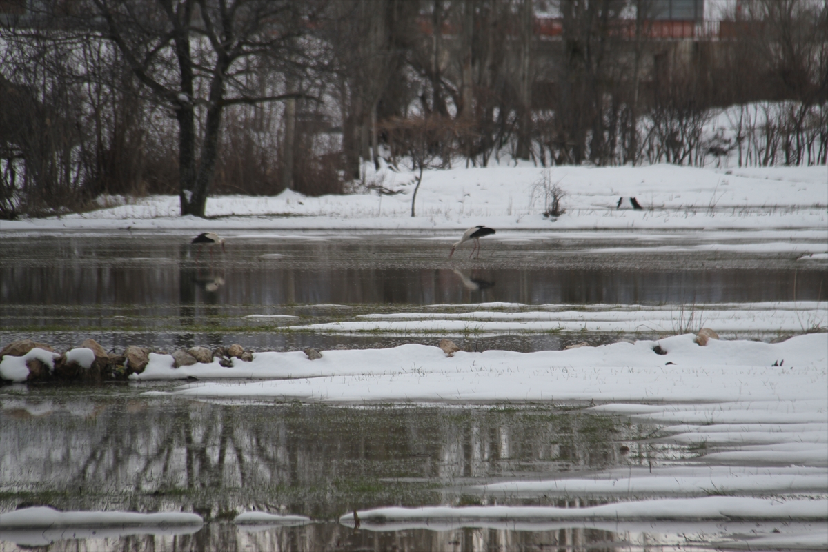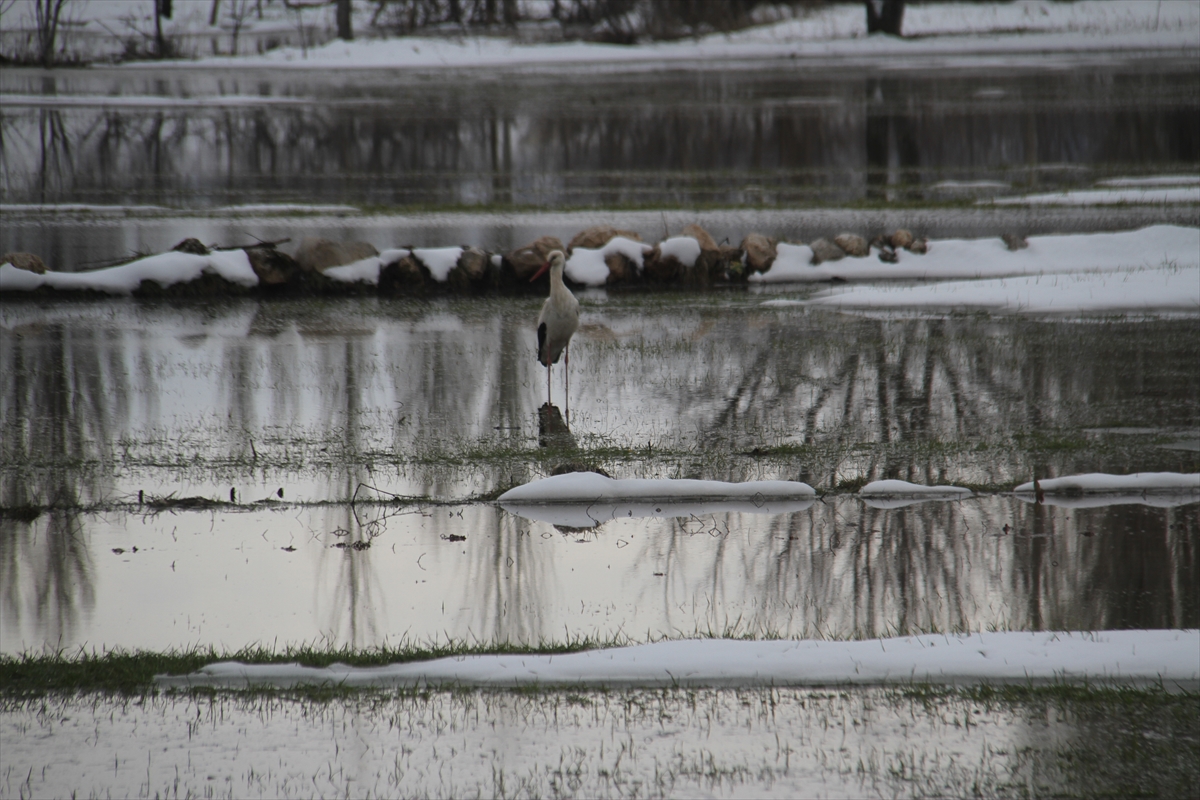 Leylekler Vadisi’ndeki yuvalarına geldiklerinde kar örtüsü sürprizi ile karşılaşan leylekler, eriyen kar sularının içerisinde gezerek yiyecek arayışına girdi.
