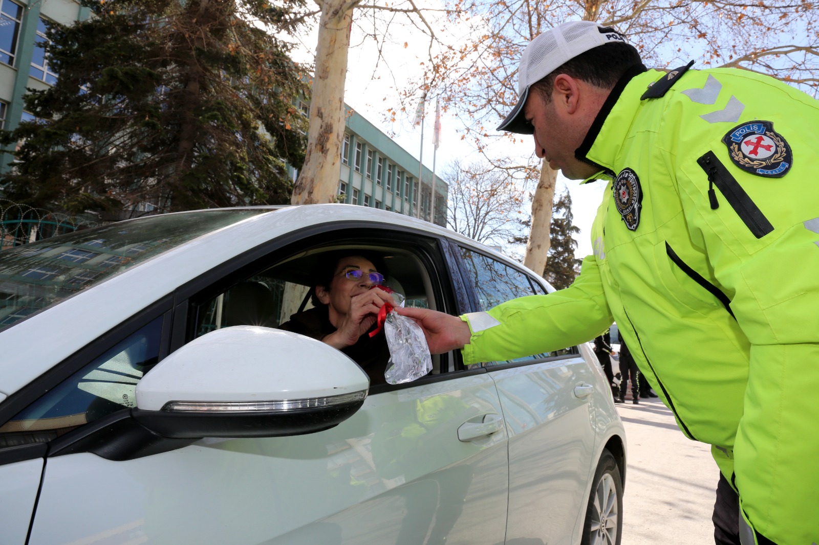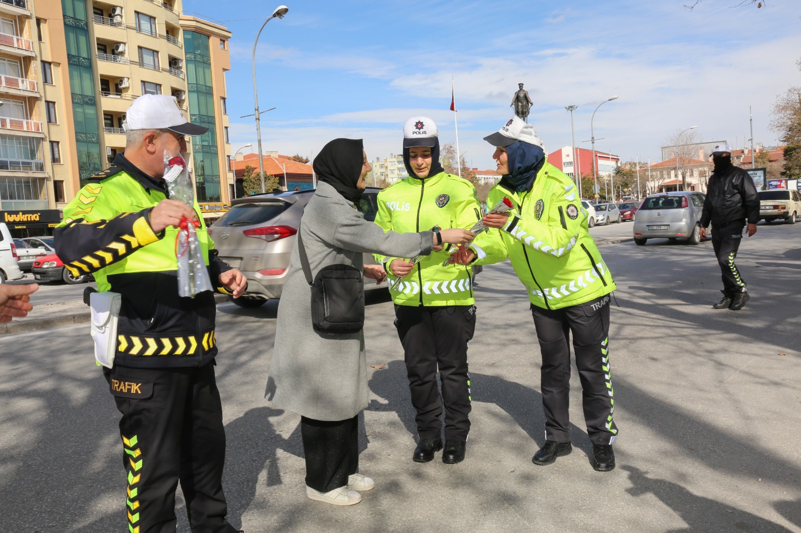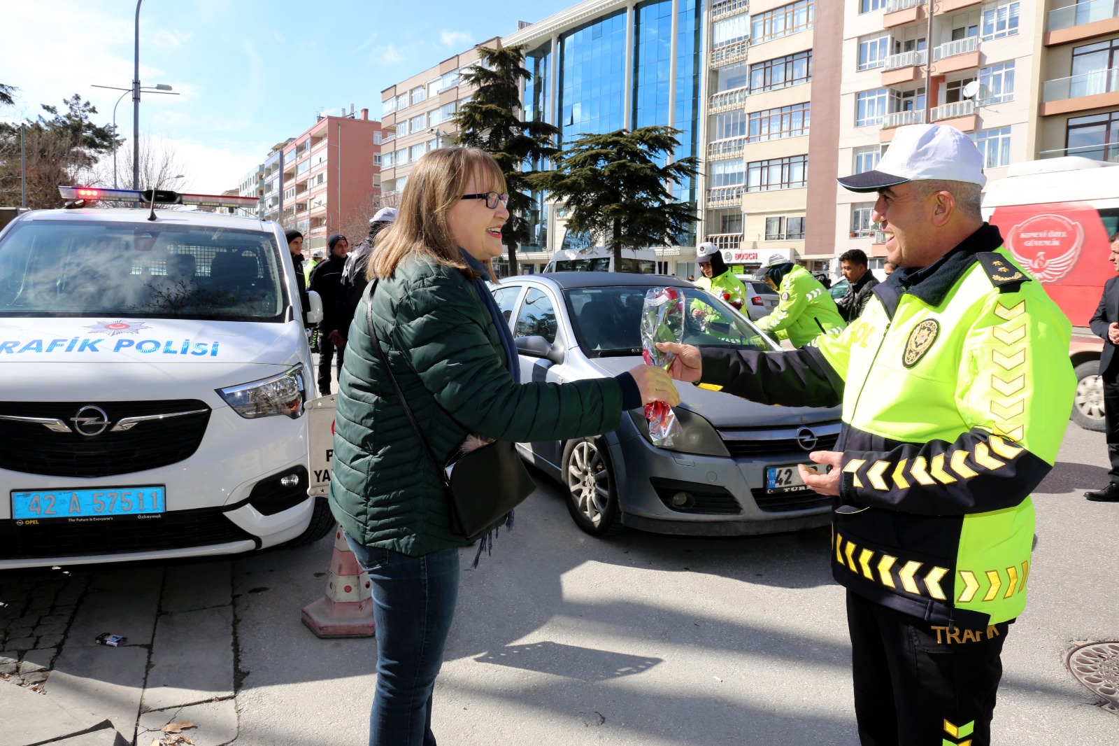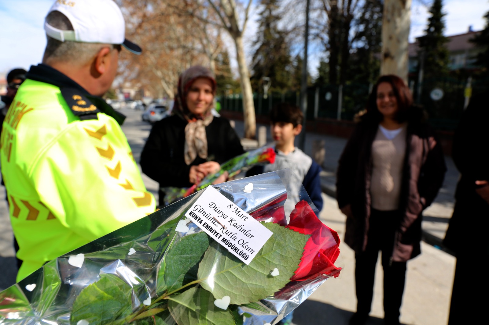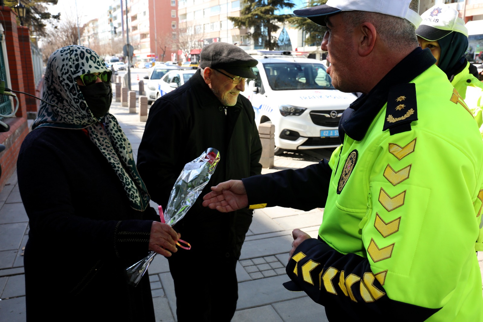 Trafikteki örnek davranışlarından dolayı Konya Emniyet Müdürlüğü, kadın sürücüleri trafik uygulamasında durdurarak 8 Mart Dünya Kadınlar Günü’nü kutladı. Trafik Denetleme Şube Müdürlüğü’nün katıldığı uygulamada kadın sürücülere gül ve çikolata taktim edildi.