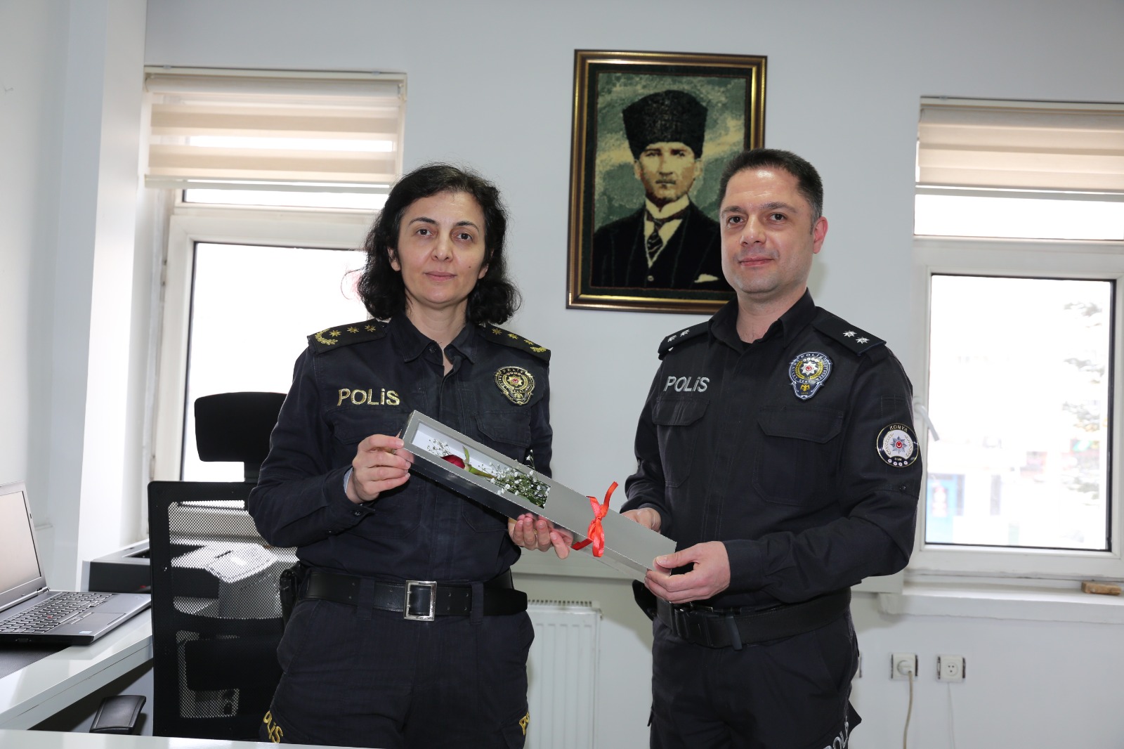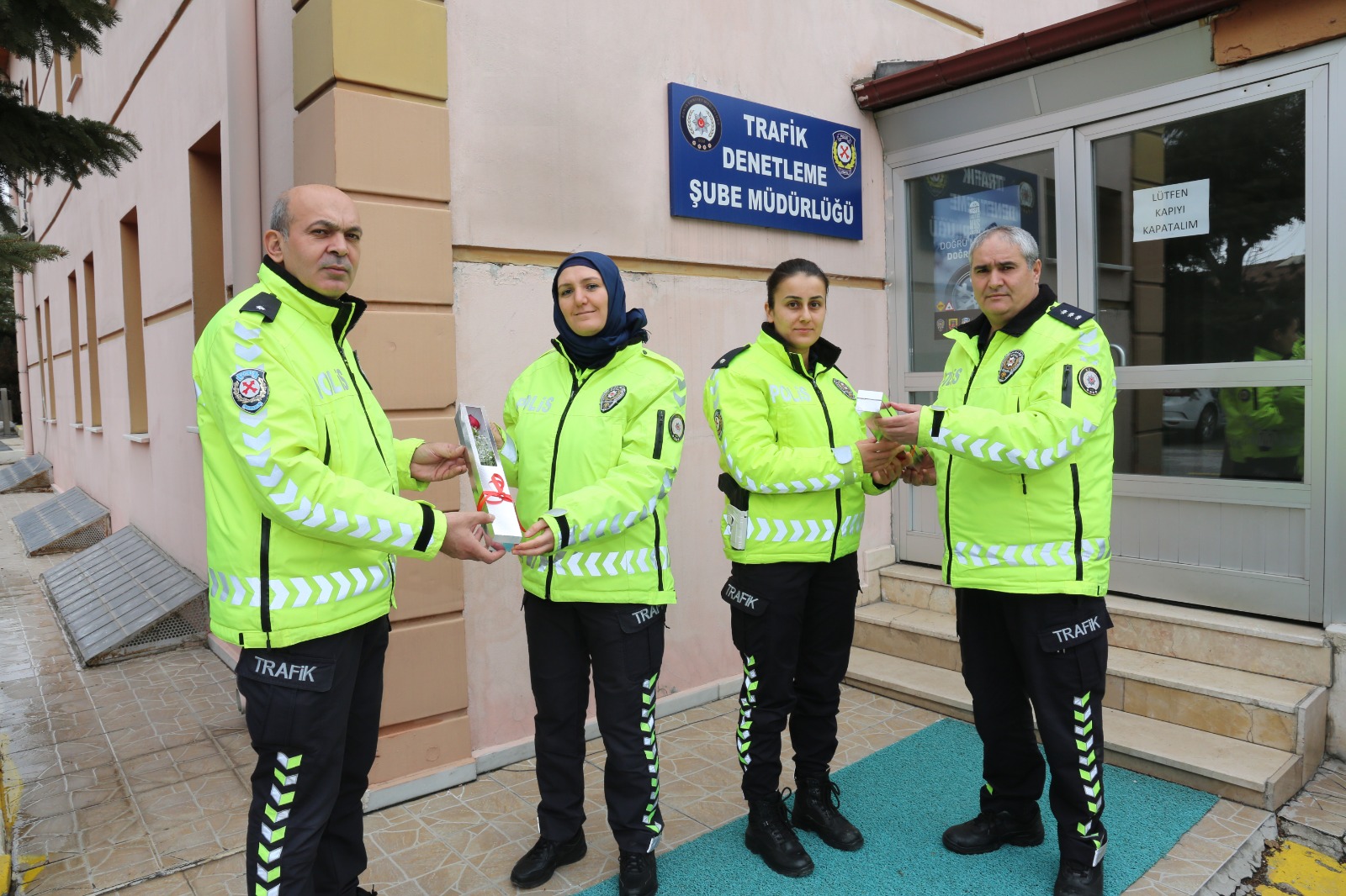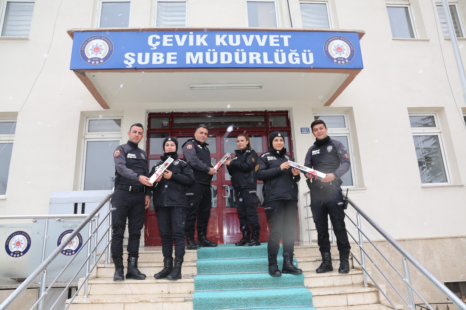 Konya İl Emniyet Müdürlüğü zor şartlarda başarıyla görevini yapan ve hepimizin gurur kaynağı olan kadın polislerimize gül taktim ederek kadın polislerimizin de 8 Mart Dünya Kadınlar Günü’nü kutladı. Çevik kuvvet Şube Müdürlüğü’nden Toplumsal Destekli Polislik Şube Müdürlüğü’ne, Trafik Şube Müdürlüğünden Polis Merkez Amirliklerine 7 gün 24 saat her alanda başarıyla görev yapan kadın polislerimizi Konya Emniyet Müdürlüğü unutmayarak bu özel günde gül taktim etti.