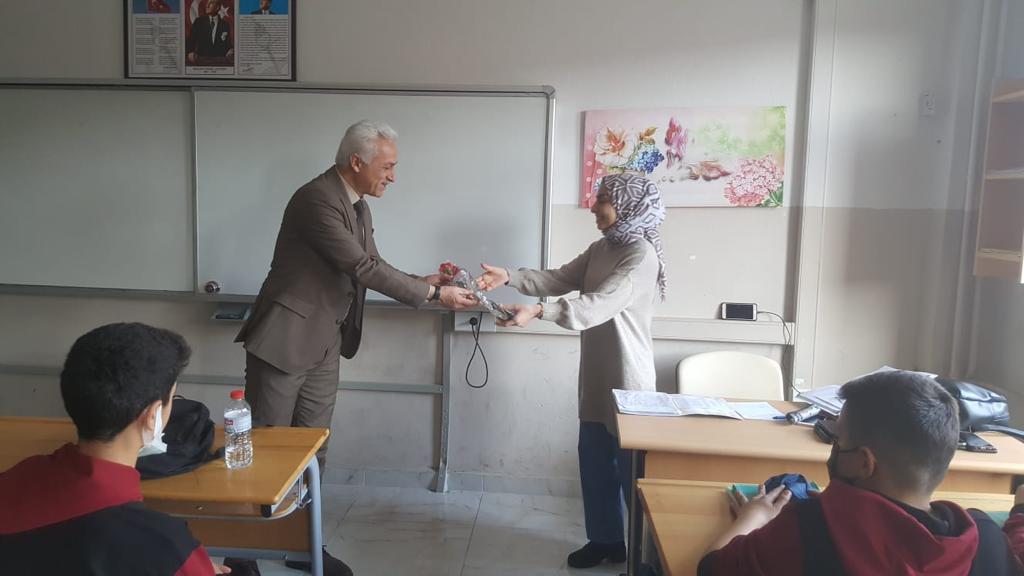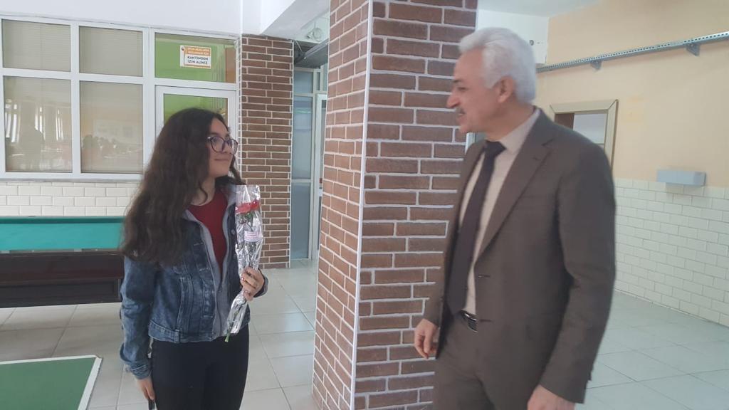 Anne ve abla şefkati ile yaklaşan, öğretmenlerimize, ayrıca personel ile öğrencilerimize, saygı ve sevgimizin göstergesi olarak sembolik çiçek takdim edildiğini belirtti.