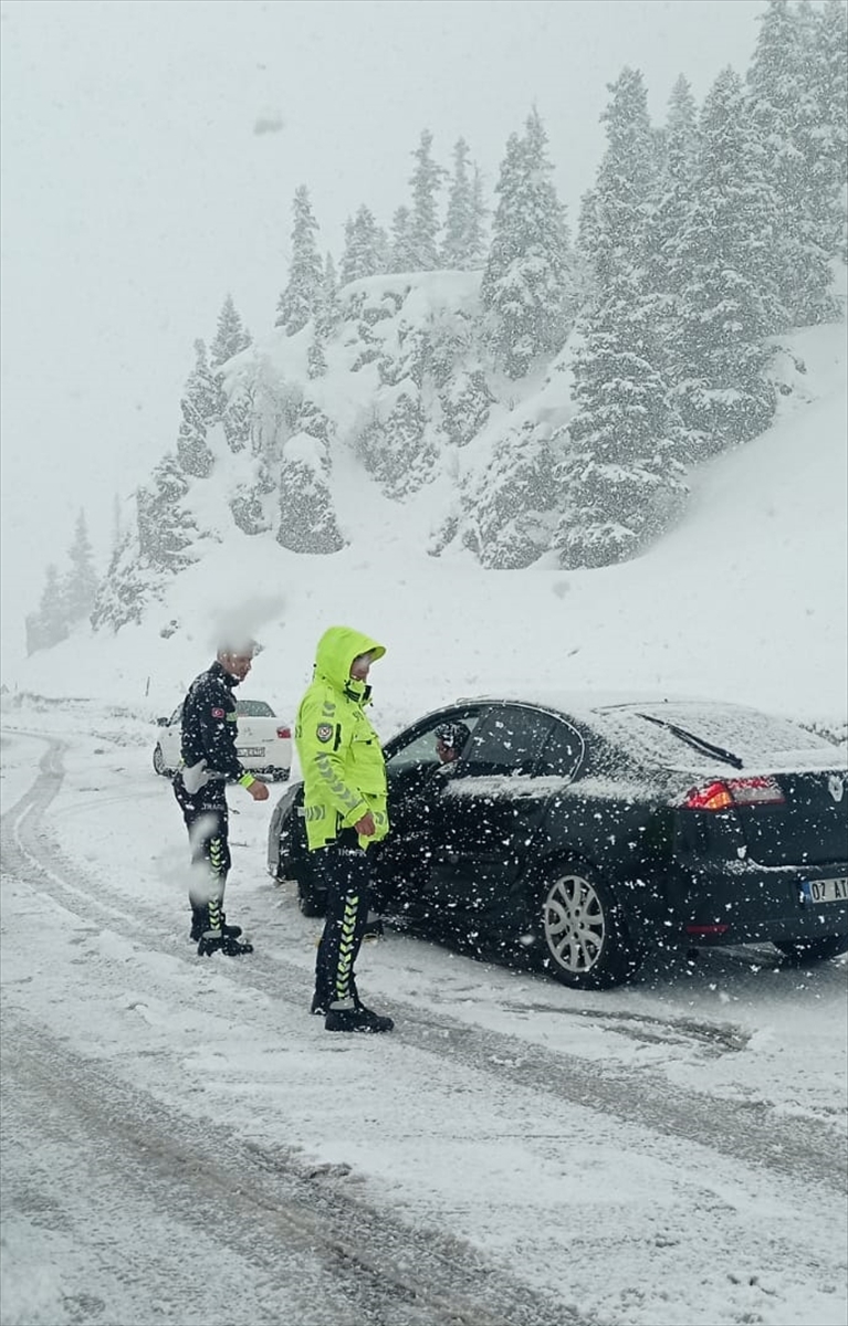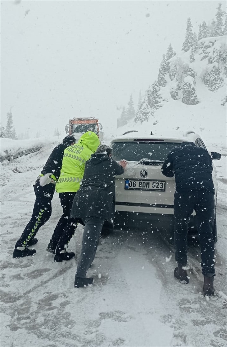 Yoğun kar yağışının etkili olduğu Antalya-Konya kara yolunda karla mücadele çalışması sürdürülüyor. Polis ekipleri, yolda mahsur kalanlara araçlarına zincir takarak ve kara saplanan araçları kurtararak yardım etti.