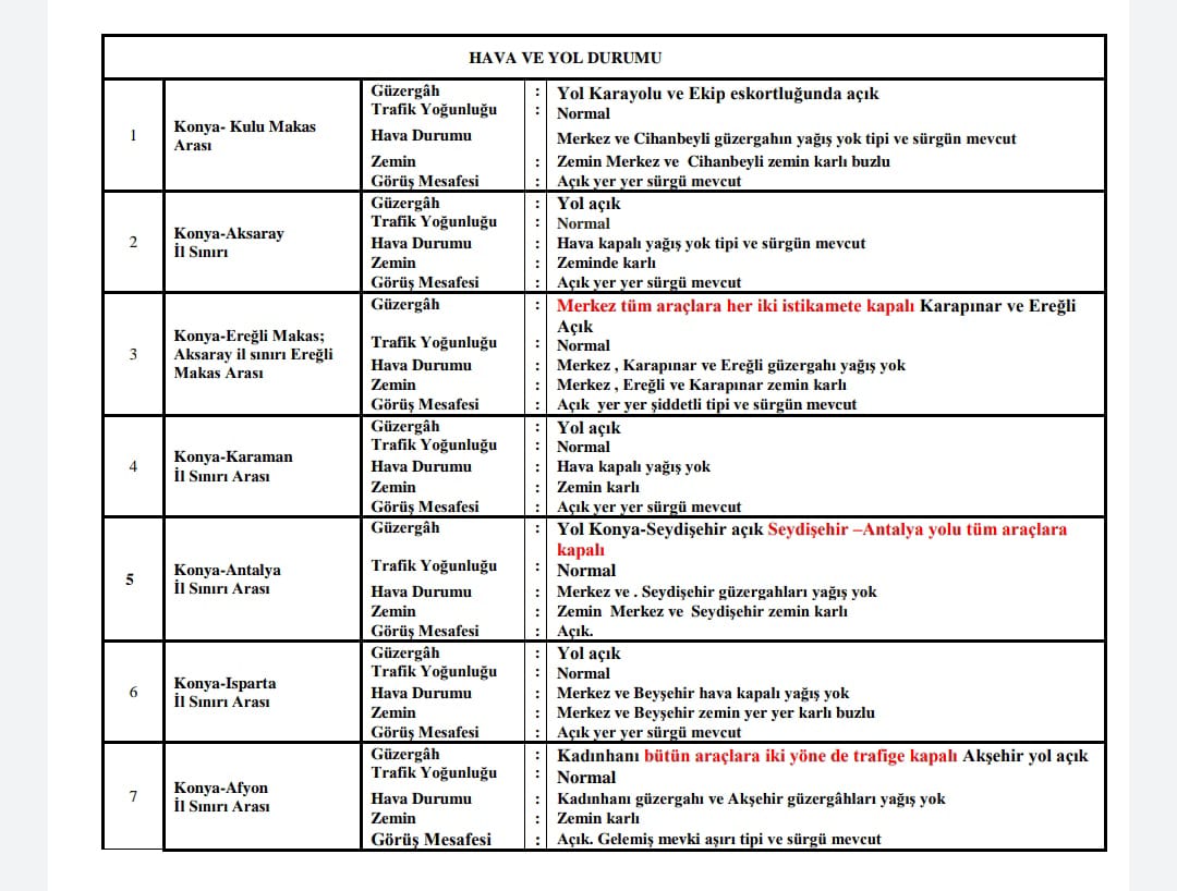 Akşam saatlerinde etkisini artıran kar yağışı dolayısıyla kapanan Afyonkarahisar, Ankara, Aksaray, Karaman, ve Isparta kara yolu, kontrollü olarak trafiğe açıldı.