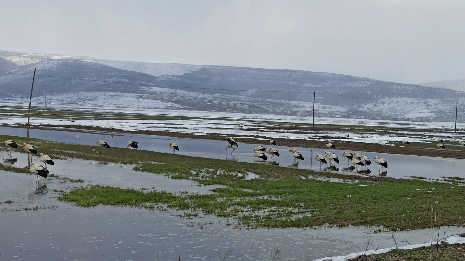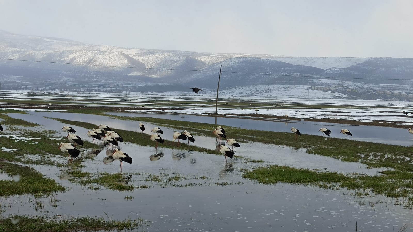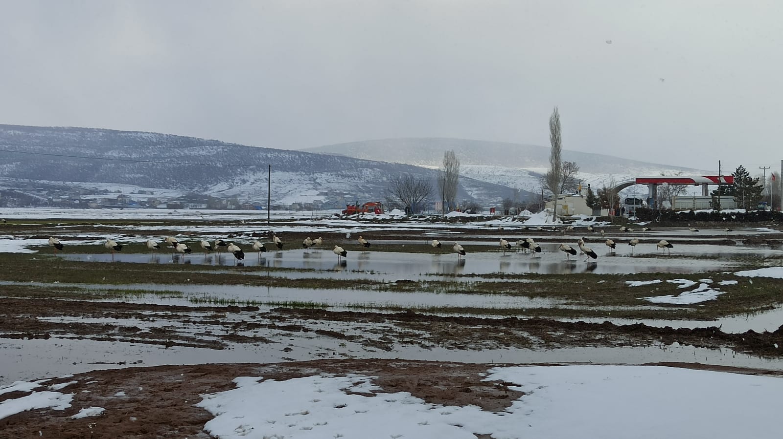 Baharın müjdecisi olarak nitelendirilen ve havaların ısınmaya başlamasıyla yurda gelen leylekler, Olumsuz hava Şartlarından dolayı Seydişehir’de boş arazilerde görülüyor.