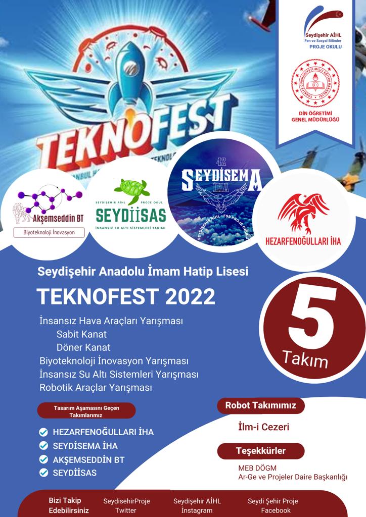 İlçemizi TEKNOFEST’te iki yıldır başarı ile temsil eden Seydişehir Anadolu İmam Hatip Lisesi- Fen ve Sosyal Bilimleri Proje Okulu Takımları, TEKNOFEST 2022 yarışmaları kapsamında yaptıkları projelerle bu alandaki başarılarını bir üst seviyeye taşıdılar.