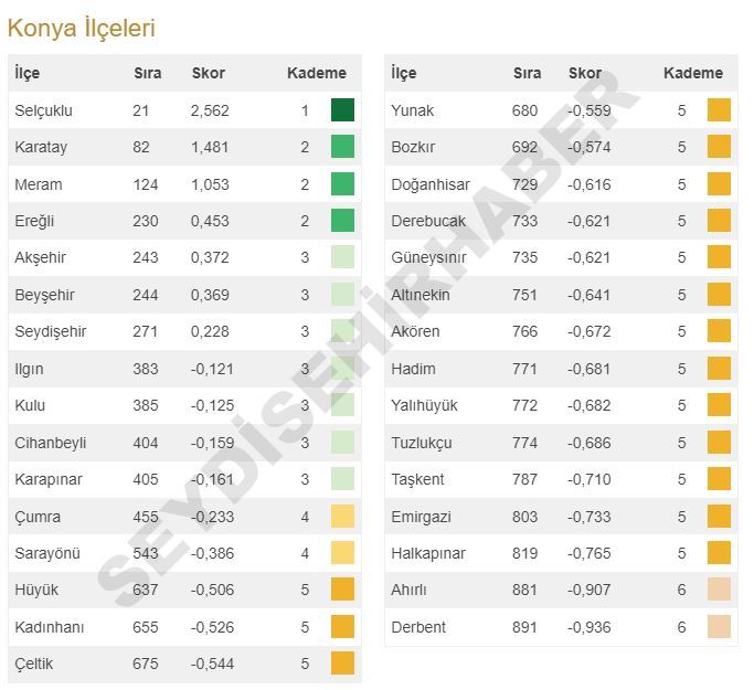 Türkiye'nin Sosyo-Ekonomik Gelişmişlik Sıralaması Araştırmaları (SEGE), Sanayi ve Teknoloji Bakanlığı tarafından açıklandı. Buna göre; Konya’nın en gelişmiş ilçe sıralaması da belli oldu. İlk sırada, birinci kademeye de giren Selçuklu var.