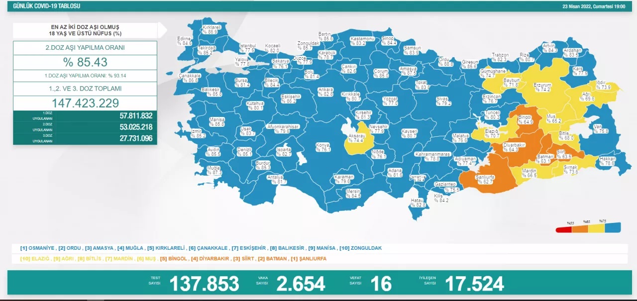Türkiye'de son 24 saatte 137 bin 853 COVID-19 testi yapıldı, 2 bin 654 kişinin testi pozitif çıktı, 16 kişi yaşamını yitirdi.