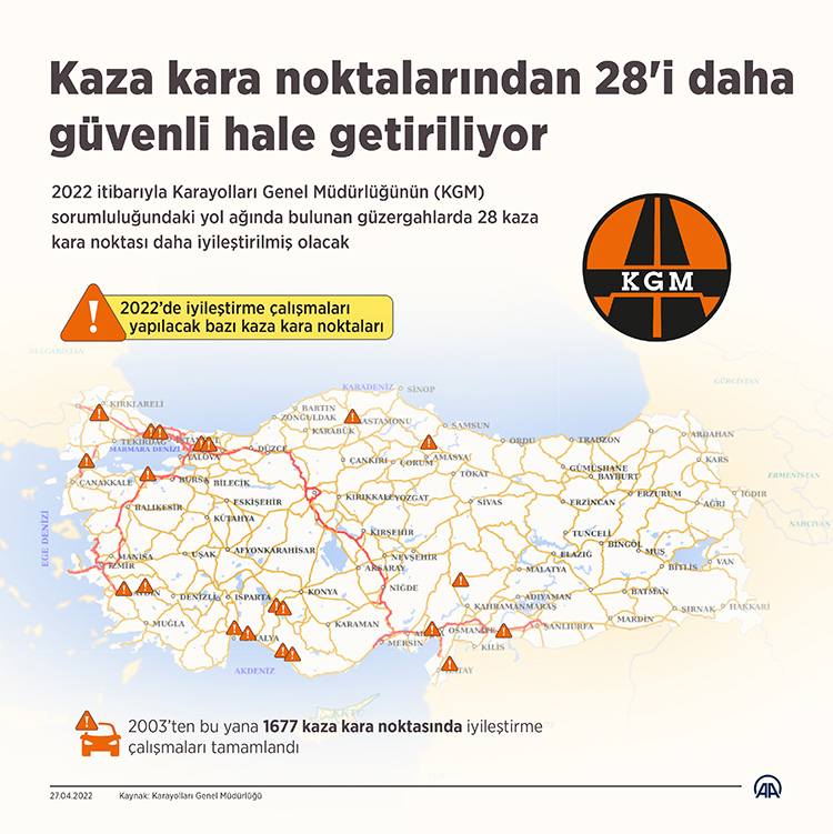 Bu yıl itibarıyla KGM'nin sorumluluğundaki yol ağında bulunan güzergahlarda 28 kaza kara noktası daha iyileştirilmiş olacak.