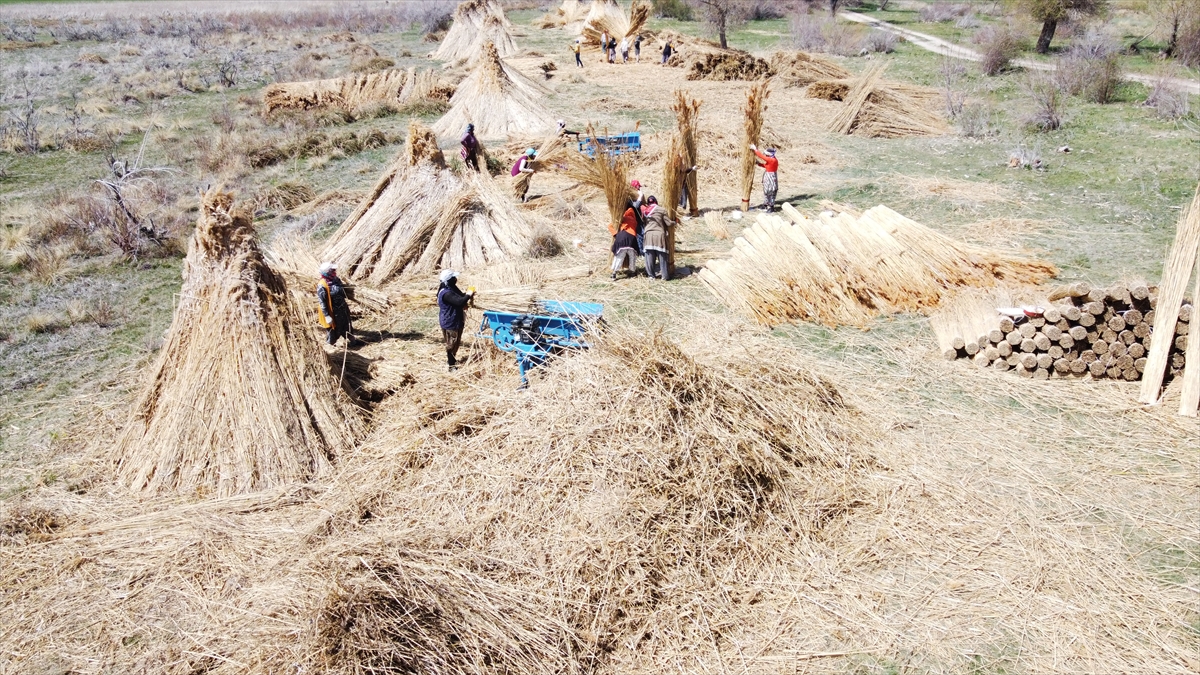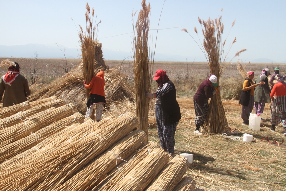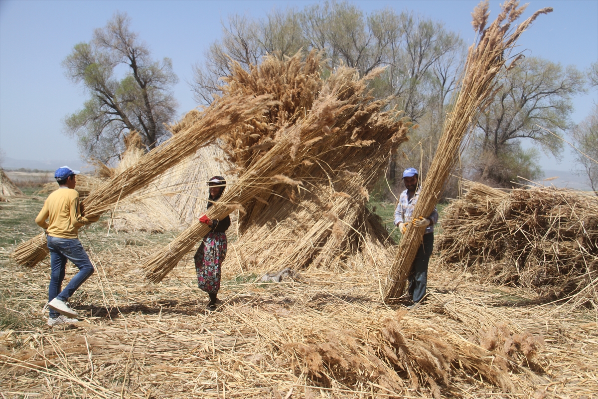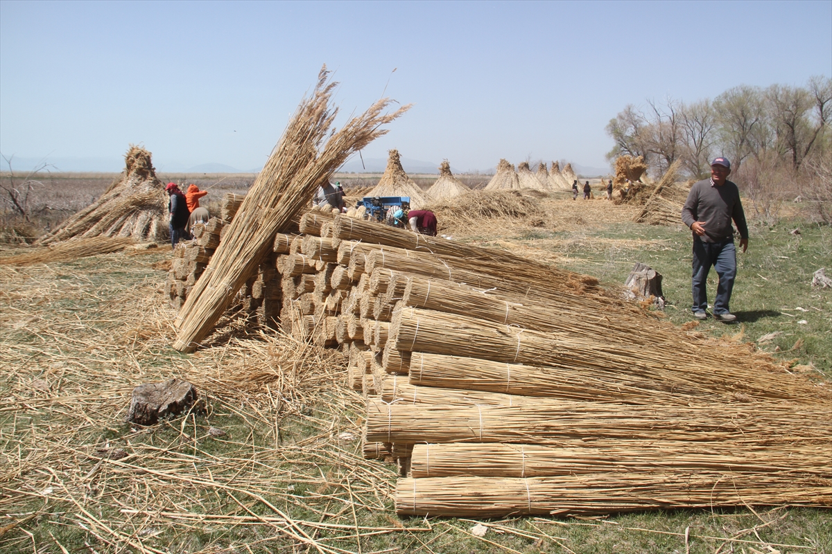 "Sezonumuz 12. ayın sonunda başlar. Özel izin istenirse ve coğrafya da uygunsa bu şubat başına kadar devam edebilir. Göl kıyısında orakla, elle hasat edip biçtiğimiz kamışları, kıyıda 'hu' diye adlandırdığımız öbek haline getiriyoruz. Olgunlaşması için bunların üzerinden bir kış geçirmesini bekliyoruz. Bu şekilde yaprağını döküp kuruyor, renkleniyor. Olgunlaştıktan sonra ilkbaharda işlemeye başlıyoruz. Kamışların yaprağını, yabani otlarını, kalınlarını ayırmak suretiyle belli bir standart ölçüye getiriyoruz. Kelepçe dediğimiz malzemelerle de bağlıyoruz. Şu anda bu işte sadece depolarda çalışan kişi sayısı 60. Bunların yaptığı iş temizlik, balyalama ve getir götür çalışması."