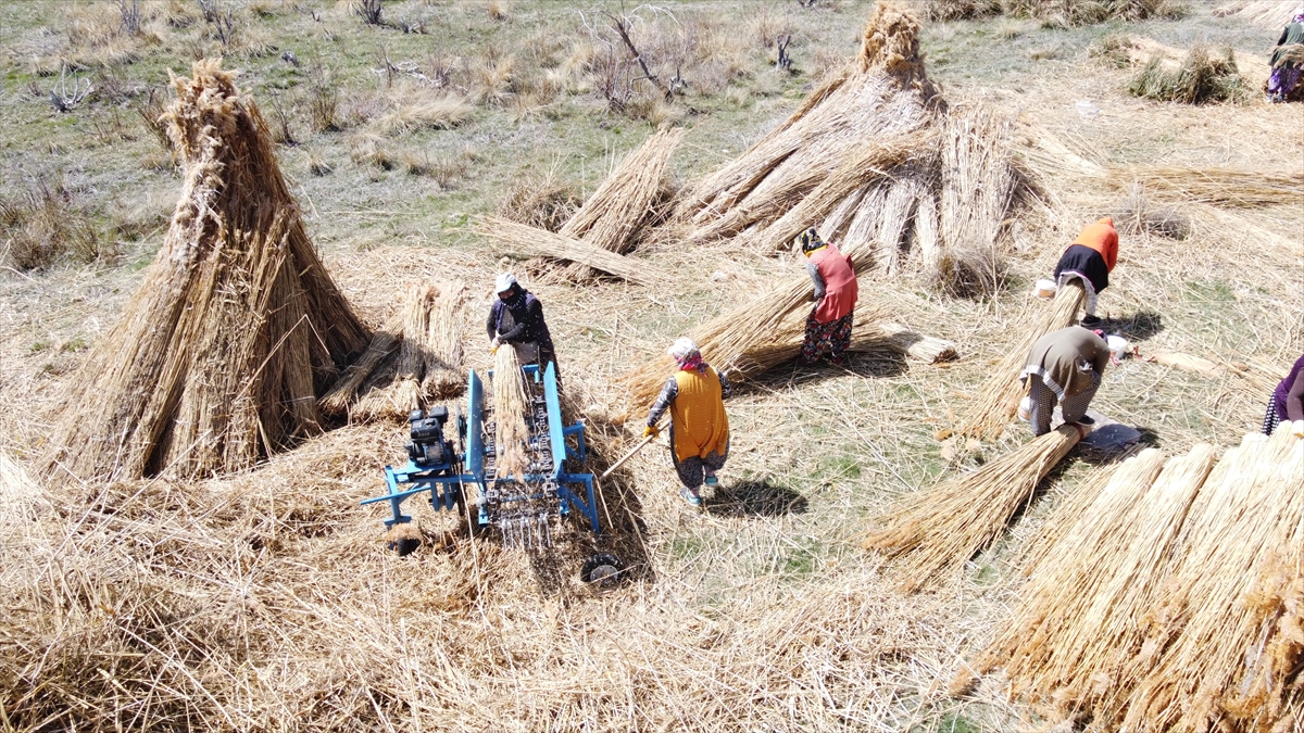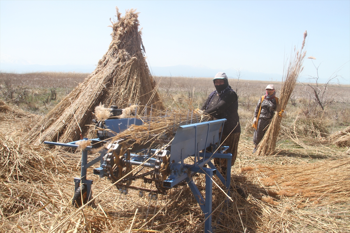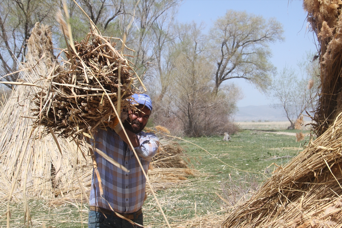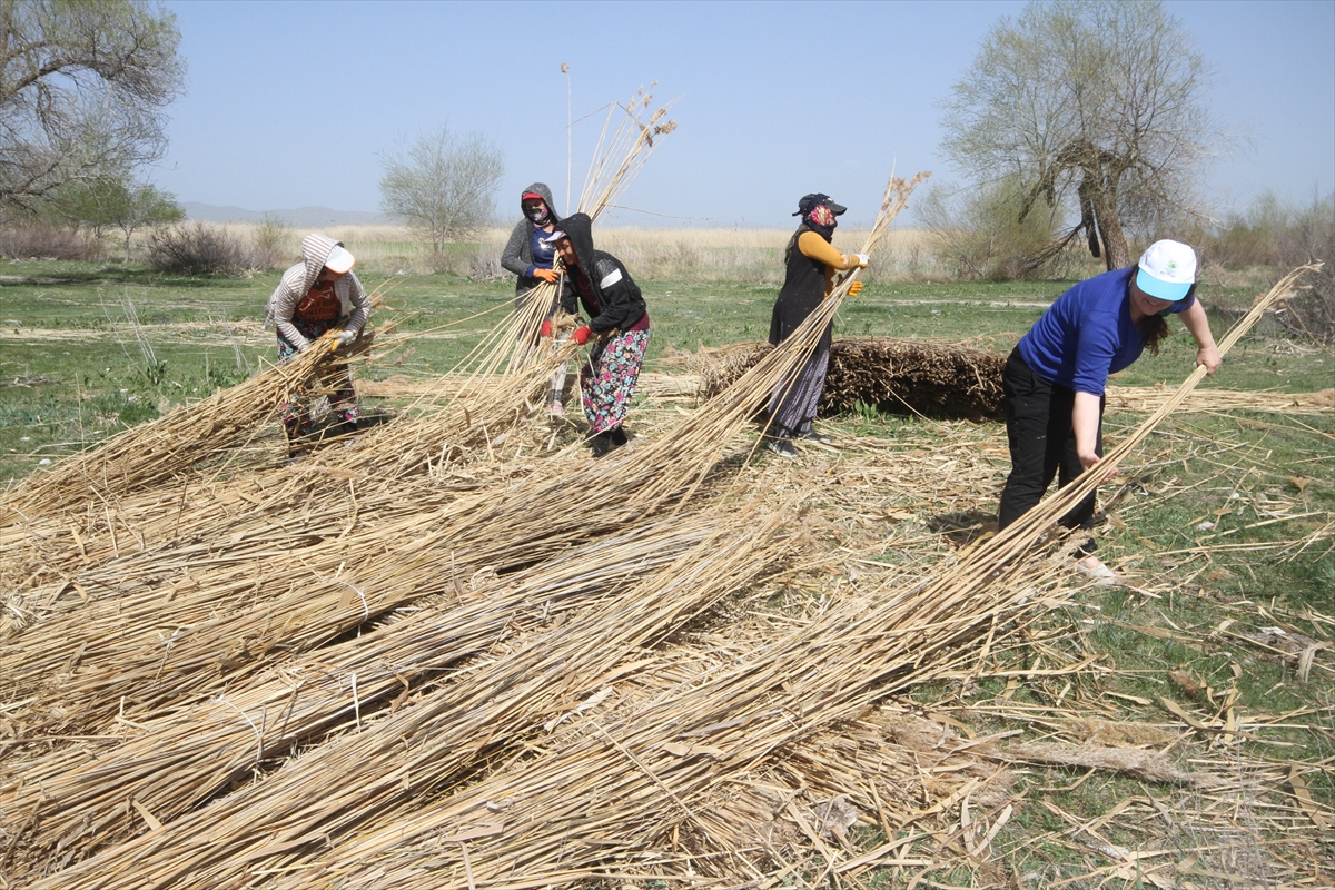 "Sezonumuz 12. ayın sonunda başlar. Özel izin istenirse ve coğrafya da uygunsa bu şubat başına kadar devam edebilir. Göl kıyısında orakla, elle hasat edip biçtiğimiz kamışları, kıyıda 'hu' diye adlandırdığımız öbek haline getiriyoruz. Olgunlaşması için bunların üzerinden bir kış geçirmesini bekliyoruz. Bu şekilde yaprağını döküp kuruyor, renkleniyor. Olgunlaştıktan sonra ilkbaharda işlemeye başlıyoruz. Kamışların yaprağını, yabani otlarını, kalınlarını ayırmak suretiyle belli bir standart ölçüye getiriyoruz. Kelepçe dediğimiz malzemelerle de bağlıyoruz. Şu anda bu işte sadece depolarda çalışan kişi sayısı 60. Bunların yaptığı iş temizlik, balyalama ve getir götür çalışması."