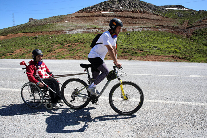 BİTLİS (AA) - ŞENER TOKTAŞ - Bitlis'in Hizan ilçesindeki Kadir Has Anadolu Lisesinde beden eğitimi öğretmenliği yapan Necip Bozdemir, bisikletinin arkasına monte ettiği tekerlekli sandalyeyle yaklaşık 55 kilometre pedal çevirerek bedensel engelli Tahsin Gencer'in bisikletle tur atma ve kamp yapma hayalini gerçekleştirdi.