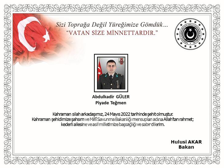 28 yaşındaki şehit Teğmen Abdulkadir Güler'in de acı haberi, Antalya Konyaaltı ilçesi Uncalı Mahallesi'nde oturan ailesine yetkililer tarafından verildi. Şehit Güler'in evine Türk bayrakları asıldı. Antalya Büyükşehir Belediyesi ekipleri, taziye çadırı kurdu. Şehidin annesi Berrin ve babası Mesut Güler'in yakınları, taziye evine akın etti. Bekar olan Güler, Uncalı Şehitliği'ne defnedilecek.