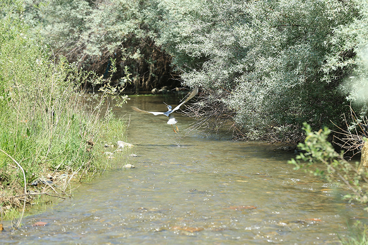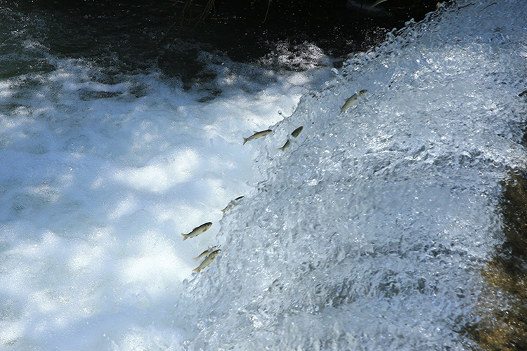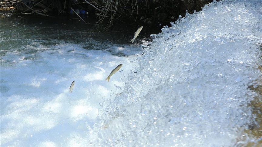 Yumurta bırakmak için Kürk Deresi başta olmak üzere bölgedeki derelere yüzen çok sayıda siraz balığı, önüne çıkan engelleri zıplayarak aşıyor.
