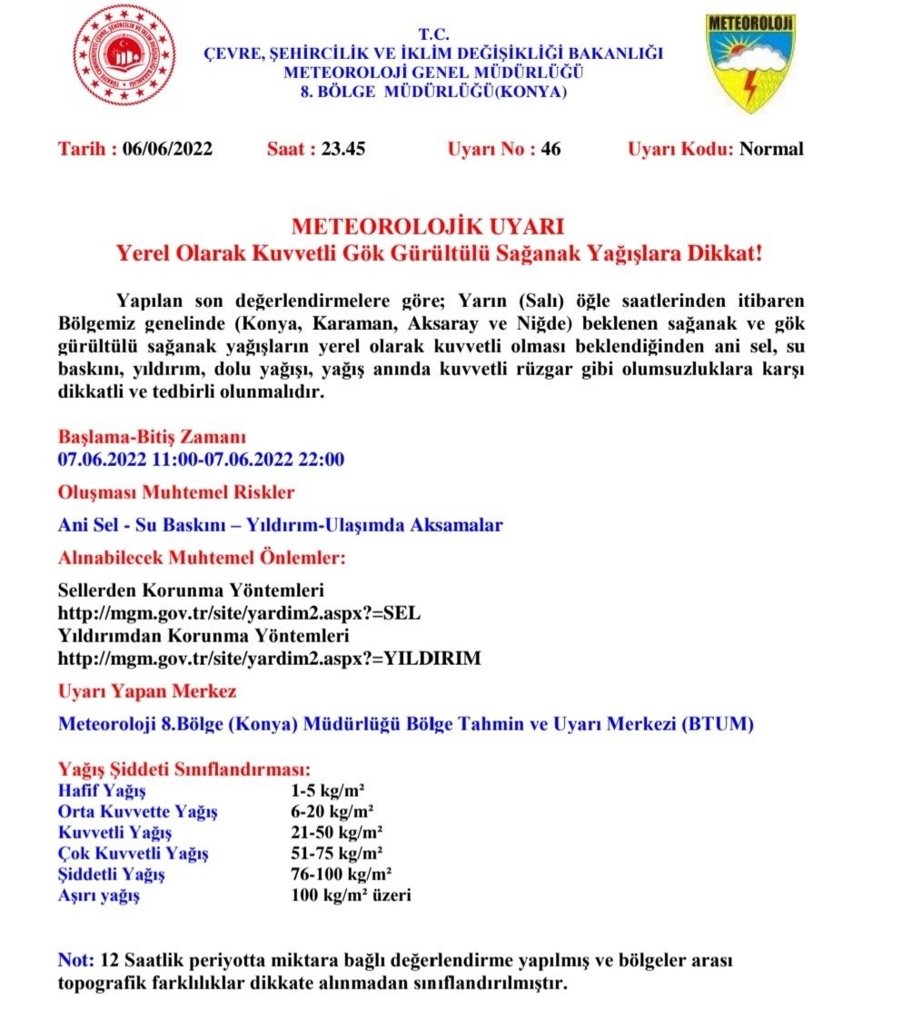 Sel, su baskını, yıldırım, ulaşımda aksamalar, yerel dolu yağışı, yağış anında kuvvetli rüzgar, hortum gibi olumsuzluklara karşı dikkatli ve tedbirli olunması gerekiyor.
