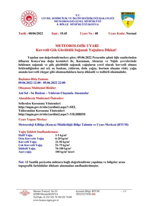 Meteorolojinin uyarısında şu ifadeler kullanıldı: Yapılan son değerlendirmelere göre 9 Haziran Perşembe günü öğle saatlerinden itibaren Konya'nın Doğu kesimleri ile Karaman Aksaray ve Niğde çevrelerinde beklenen sağanak ve gök gürültülü sağanak yağışların yerel olarak kuvvetli olması beklendiğinden, ani sel, su baskını, yıldırım, dolu yağışı, hortum oluşma riski, yağış anında kuvvetli rüzgar gibi olumsuzluklara karşı dikkatli ve tedbirli olunmalıdır.