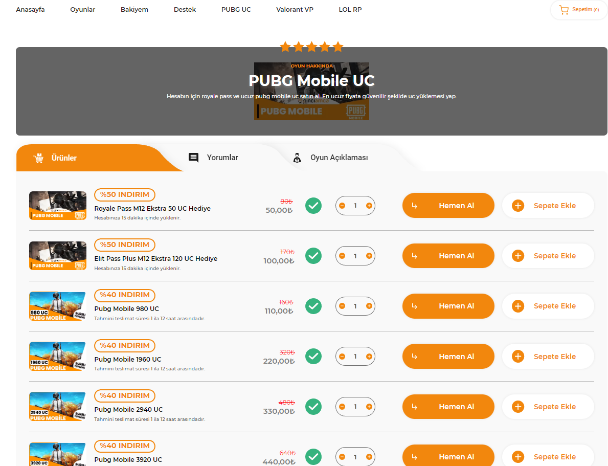 Pinci Amca'nın internet sitesinde PUBG Mobile için unknown cash'ler indirimli fiyatlarla satışa sunulmaktadır. İhtiyacınız olan ya da istediğiniz miktarı sunan paketi seçerek PUBG Mobile da daha başarılı olmak adına tek bir tıkla unknown cash yükleyebilirsiniz. Bu halde oyun oynayan oyuncular doğrulusunda sıkça fikir edinilen hususların başında ise PUBG hesabına ucuz fiyatlarla unknown cash yüklemenin nasıl uygulanacağı gelmektedir. Bu siteyi kullanarak çok makul fiyatlarla hesabınızapubg mobile uc yükleme gerçekleştirebilirsiniz.