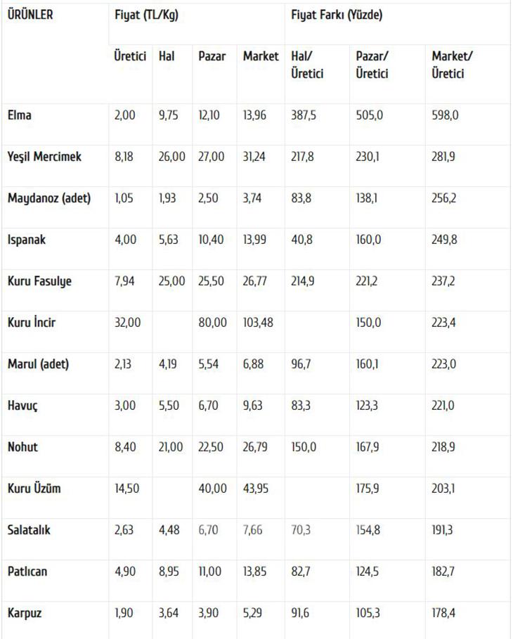 Türkiye Ziraat Odaları Birliği (TZOB) Genel Başkanı Şemsi Bayraktar, haziran ayında üretici ile market arasındaki fiyat farklılıklarını, Haziran ayı üretici ve girdi fiyatlarını değerlendirdi. Genel Başkan Bayraktar, “Haziran ayında fiyatı en fazla artan ürün markette Antep fıstığı, üreticide sivri biber, fiyatı en fazla düşen ürün ise markette ve üreticide domates oldu” dedi.Türkiye Ziraat Odaları Birliği üretici ile market arasındaki fiyat farklılıklarını açıkladıReklamTZOB Genel Başkanı Şemsi Bayraktar, üretici ile market arasındaki fiyat farklılıklarını, girdi maliyetlerini ve süt sektöründe yaşanan son gelişmeleri açıkladı.Genel Başkan Bayraktar, en fazla artışın yüzde 598 ile elmada görüldüğünü belirterek, “elmadaki fiyat farkını yüzde 281,9 ile yeşil mercimek, yüzde 256,2 ile maydanoz, yüzde 249,8 ile ıspanak, yüzde 237,2 ile kuru fasulye, yüzde 223,4 ile kuru incir, yüzde 223 ile marul ve yüzde 221 ile havuç takip etti. Haziran ayında elmada üretici market fiyat farkı yüzde 600’e yaklaşırken, 9 üründe yüzde 200’ün üzerinde gerçekleşti. Elma 7 kat, yeşil mercimek 3,8 kat, maydanoz 3,6 kat, ıspanak 3,5 kat, kuru fasulye 3,4 kat, marul, kuru incir, havuç ve nohut 3,2 kat ve kuru üzüm 3 kat fazlaya tüketiciye satıldı. Üreticide 2 lira olan elma 13 lira 96 kuruşa, 8 lira 18 kuruş olan yeşil mercimek 31 lira 24 kuruşa, 1 lira 5 kuruş olan maydanoz 3 lira 74 kuruşa, 4 lira olan ıspanak 13 lira 99 kuruşa, 7 lira 94 kuruş olan kuru fasulye 26 lira 77 kuruşa, 32 lira olan kuru incir 103 lira 48 kuruşa, 2 lira 13 kuruş olan marul 6 lira 88 kuruşa, 3 lira olan havuç 9 lira 63 kuruşa markette satıldı.” ifadelerini kullandı.