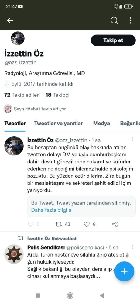 Konya Şehir Hastanesi'nde dün Doktor Ekrem Karakaya’nın öldürüldüğü silahlı saldırı olayıyla ilgili sosyal medya üzerinden Cumhurbaşkanı Recep Tayyip Erdoğan ve kamu görevlilerine hakaret içerikli paylaşım yapan Adıyaman Üniversitesi Tıp Fakültesi Radyoloji Anabilim Dalı Araştırma Görevlisi Dr. İzzettin Öz açığa alındı.